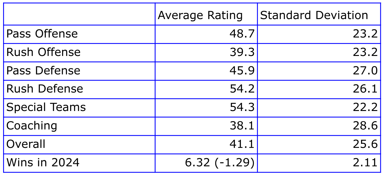 The ratings were not great, but they have two elements of statistical intrigue: the range between the best and worst ratings was only 16.2 and the standard deviations were huge in all these categories. So our individual ratings were all over the place, but collectively we converged on a narrow set of ratings across all the categories. This high variance in individual ratings is likely due to to the wild inconsistency in Cal’s performance. The first-quarter Bears looked ready to run to an easy victory, but after that the offense ground to a halt and the defense allowed Behren Morton to have one of the best days of his young career. Some raters probable emphasized the early success in the grades while others watched the entire thing before putting a grim set of ratings (and things must have been even worse for those who traveled all the way out there to suffer in the cold for 3+ hours).