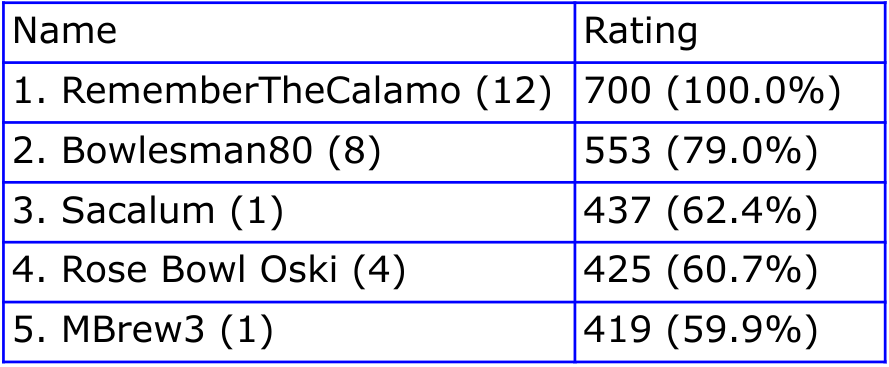 Calamo finishes the season with another perfect record of appearing among the Sunshine Pumpers, a streak that goes back to the 2018 season (if I’m remembering correctly). And as we have seen so many times previously this season, Bowlesman80 finishes in the number two spot.