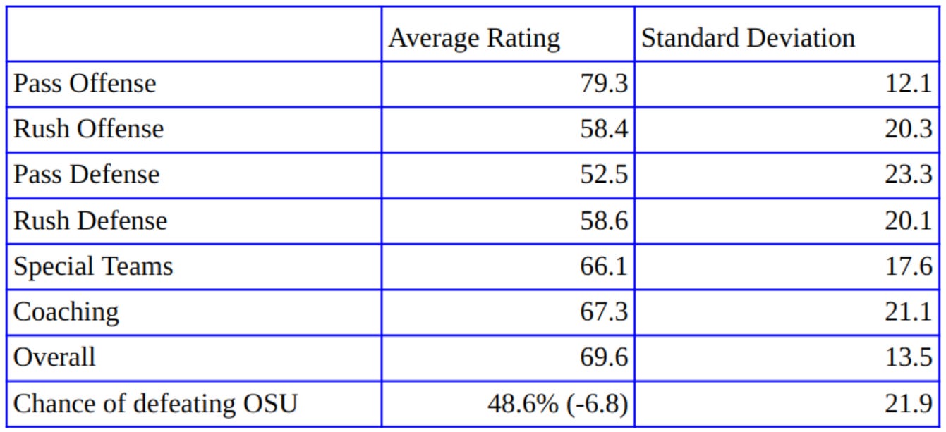 Like last week, we have a previously unthinkable situation in which pass offense earns the highest ratings by far while pass defense earns the lowest ratings of the week. The rush offense and defense earned near mirror ratings. Meanwhile coaching and overall earned their highest ratings of the losing streak. Our predictions of a win over Oregon State have dipped slightly since preseason, but that’s within the margin of error. It looks like we’re still expecting a toss-up in the house of horrors that is Reser Stadium.