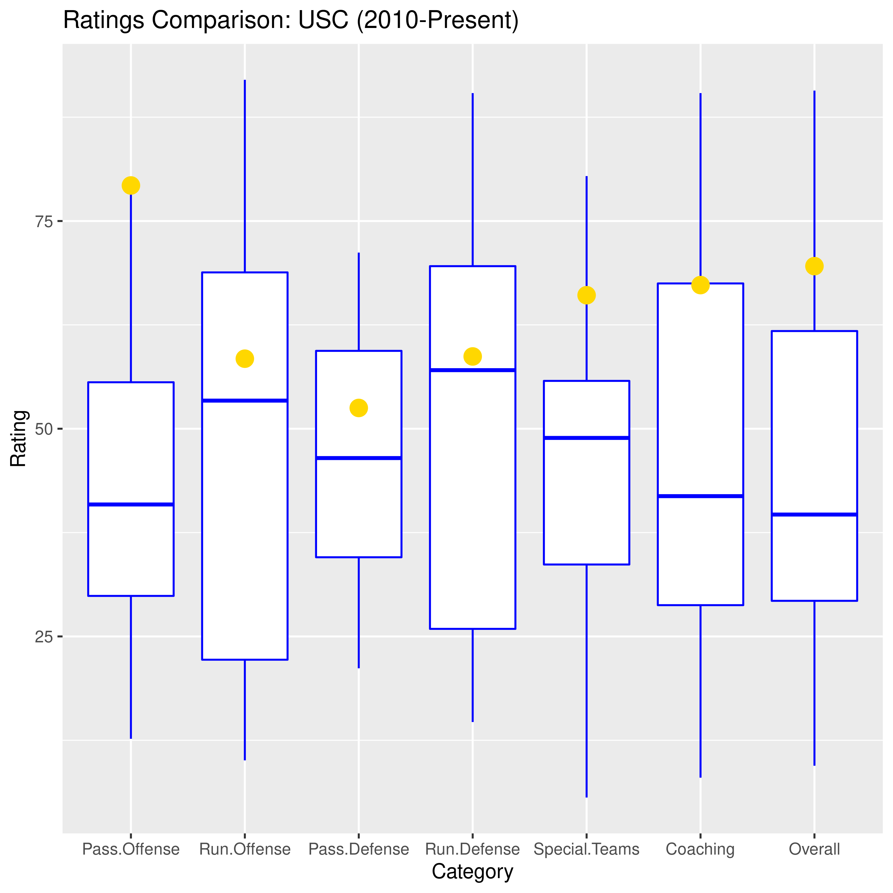 Every single category rates better than usual and pass offense posts the highest rating we’ve seen against USC. That’s an impressive feat considering four years of Bear Raid offense are in these ratings.