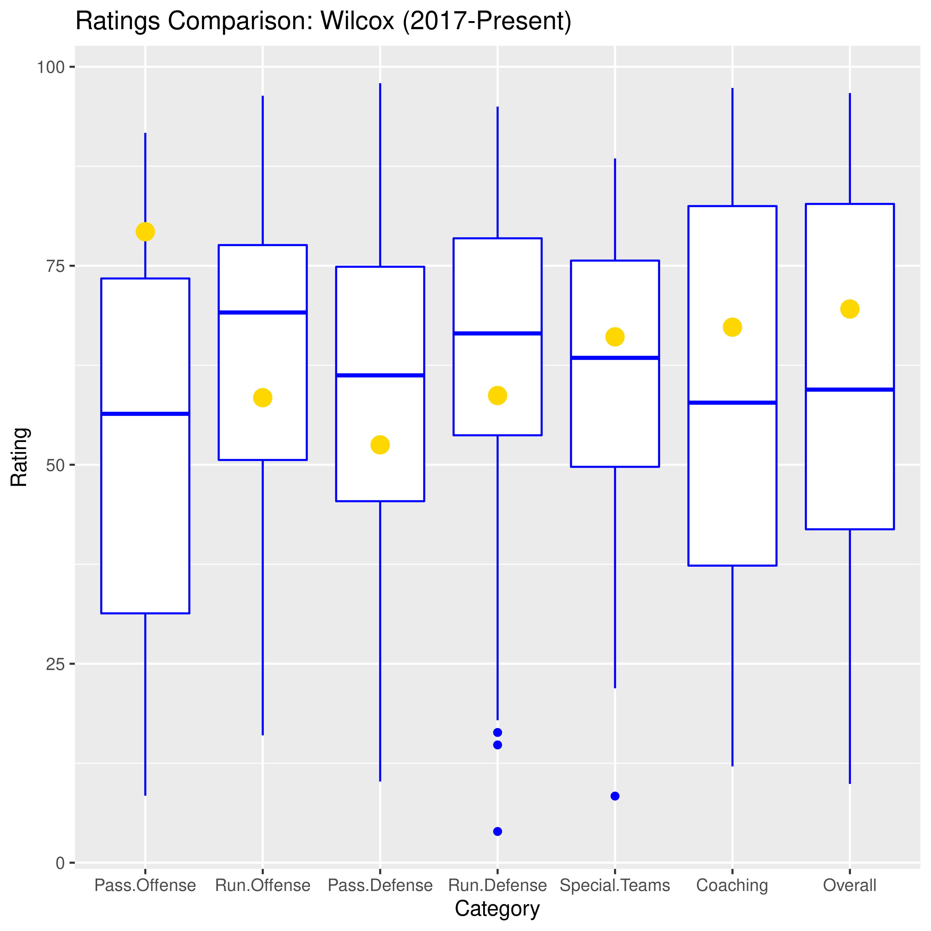 Pass offense excels, but everything else is rather middling. Every other category sits comfortably in the box capturing the middle 50% of the data.