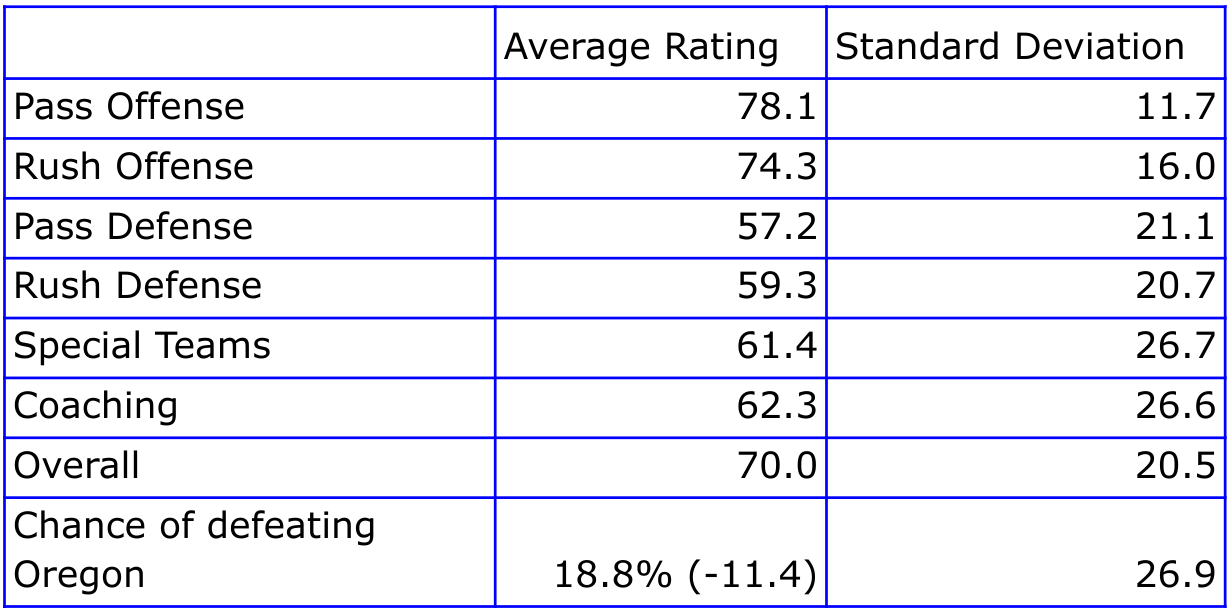 Thanks for participating! Check back Saturday afternoon following the Oregon game for this week’s rating form. I’m doubtful our ratings will be this positive next week, but I am willing to be pleasantly surprised.