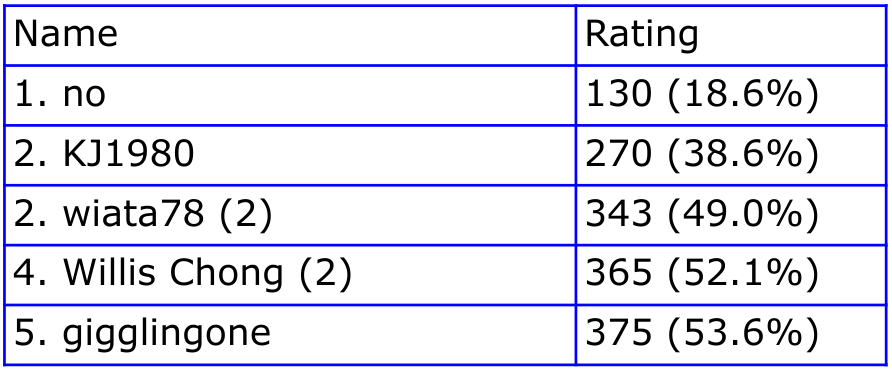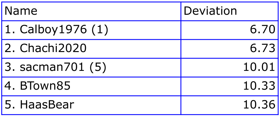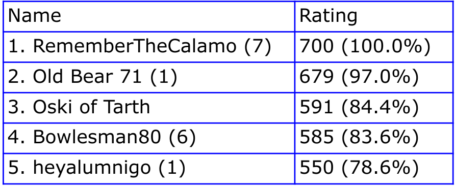 Oski of Tarth is the only winner this week who isn’t a repeat offender. And once again, we have a pretty sizeable gap between 1st and 5th (22 percentage points). With both awards categories having such large spreads, it looks like the rest of us were tucked into that gap between about 75% and 55%.
