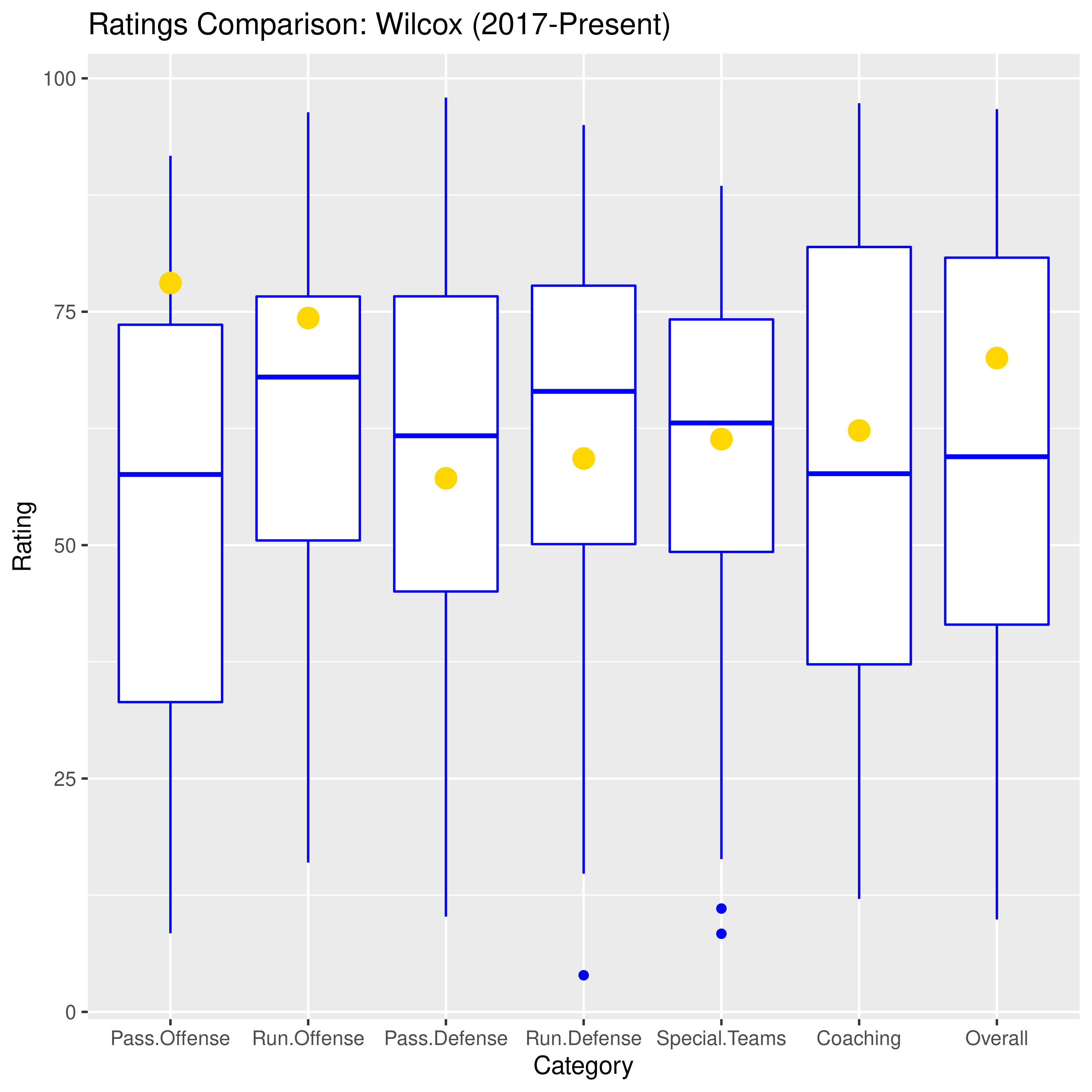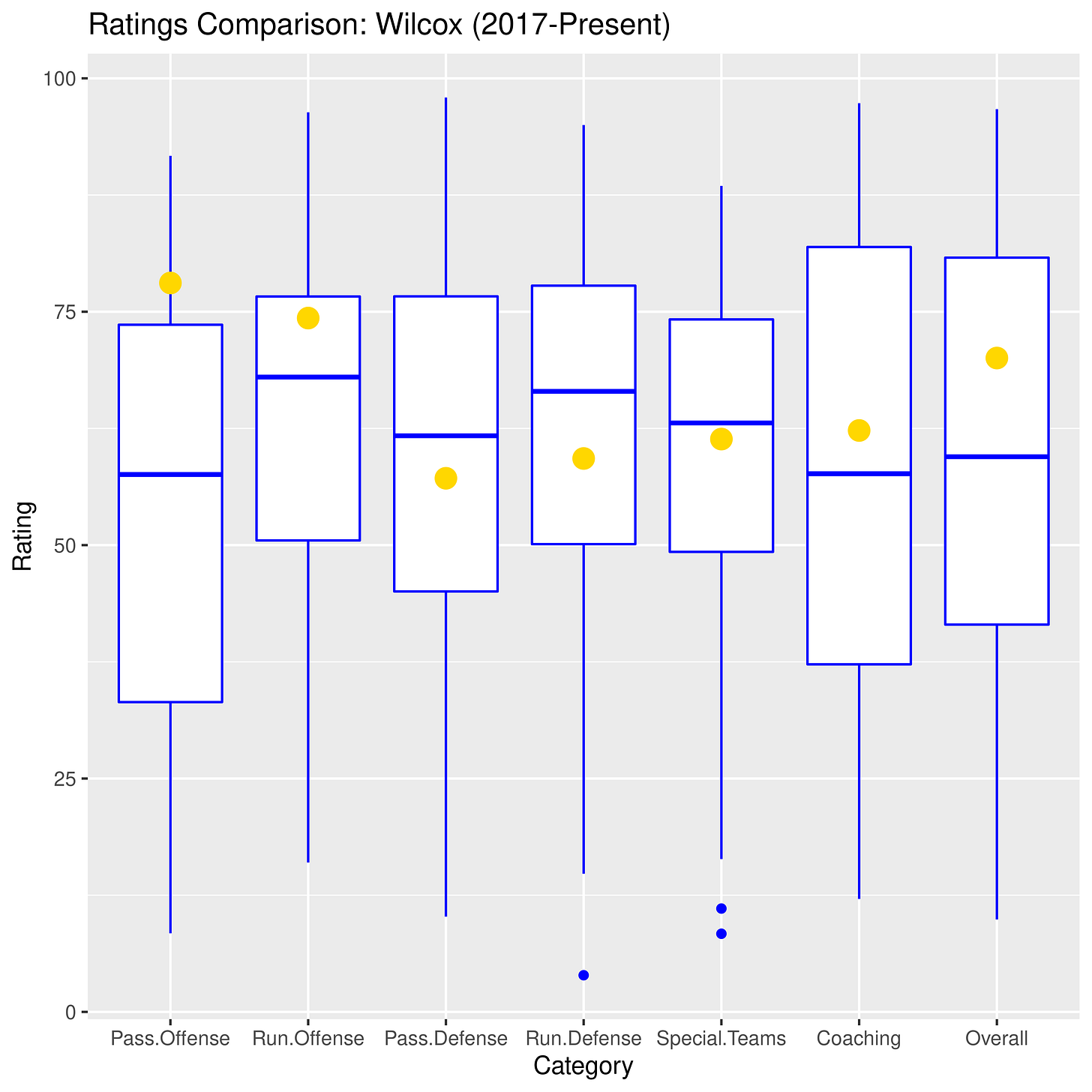 Offense was much, much better than usual while defense was slightly worse than usual. In a pleasant break from recent trends, coaching and overall earned better-than-usual ratings.