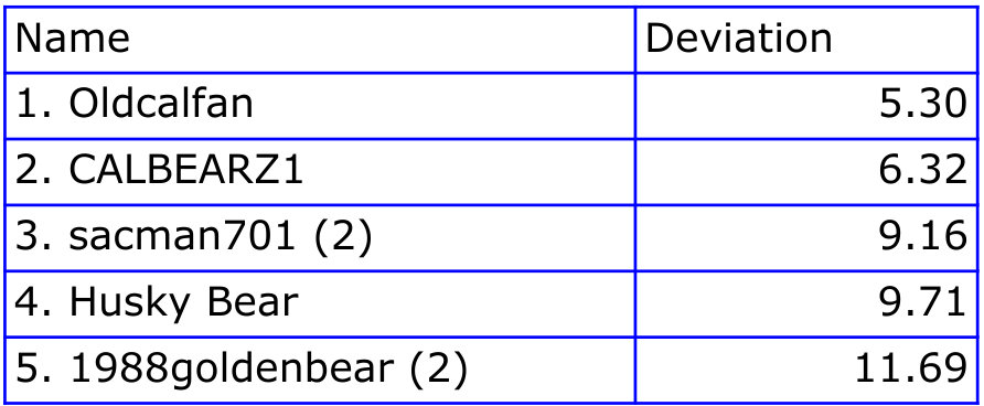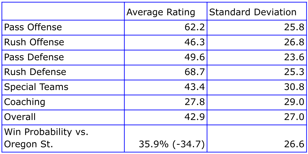 Well, well, well. Look at that. A couple categories are rated well, coaching is rated poorly, and our predictions of a win have sunk dramatically. Run defense leads the way, followed by pass offense. Nearly everything else is in the 40s—not abysmal, but far from good. And coaching once again earns the lowest scores of the week. Predictions of a win over our former Pac-12/10/8 brethren have been halved since our preseason predictions.
