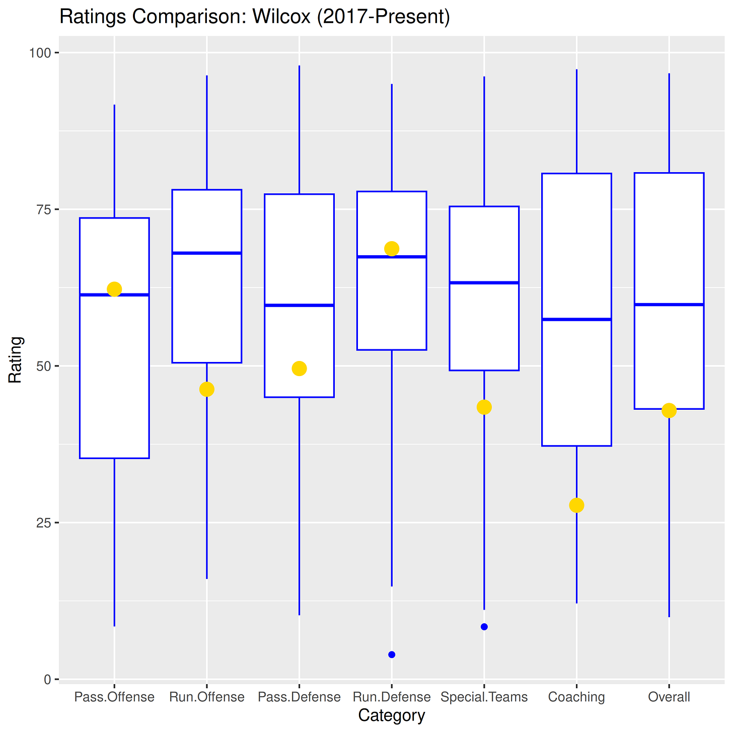 Pass offense and run defense sit slightly better than usual, while everything else is substantially worse than usual. Run offense, special teams, coaching, and overall all sit in their respective bottom 25th percentiles.