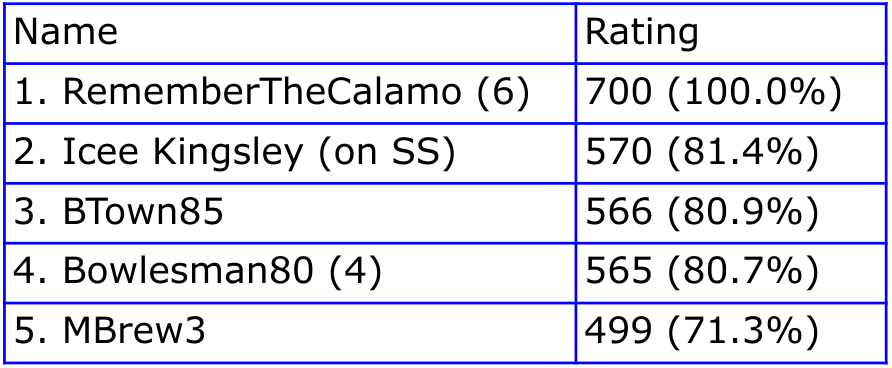 Thanks to all who participated! Hopefully we’ll see you next week.