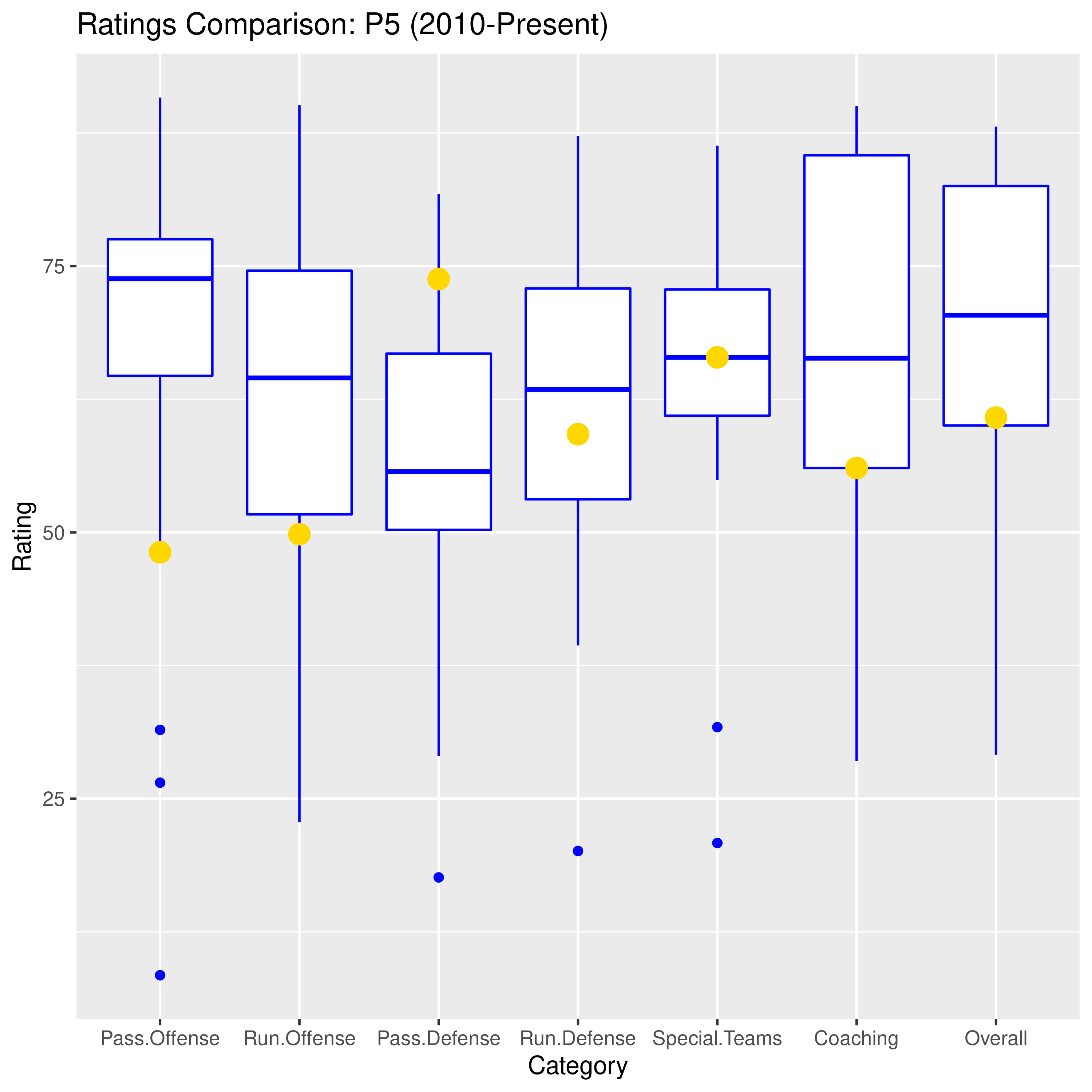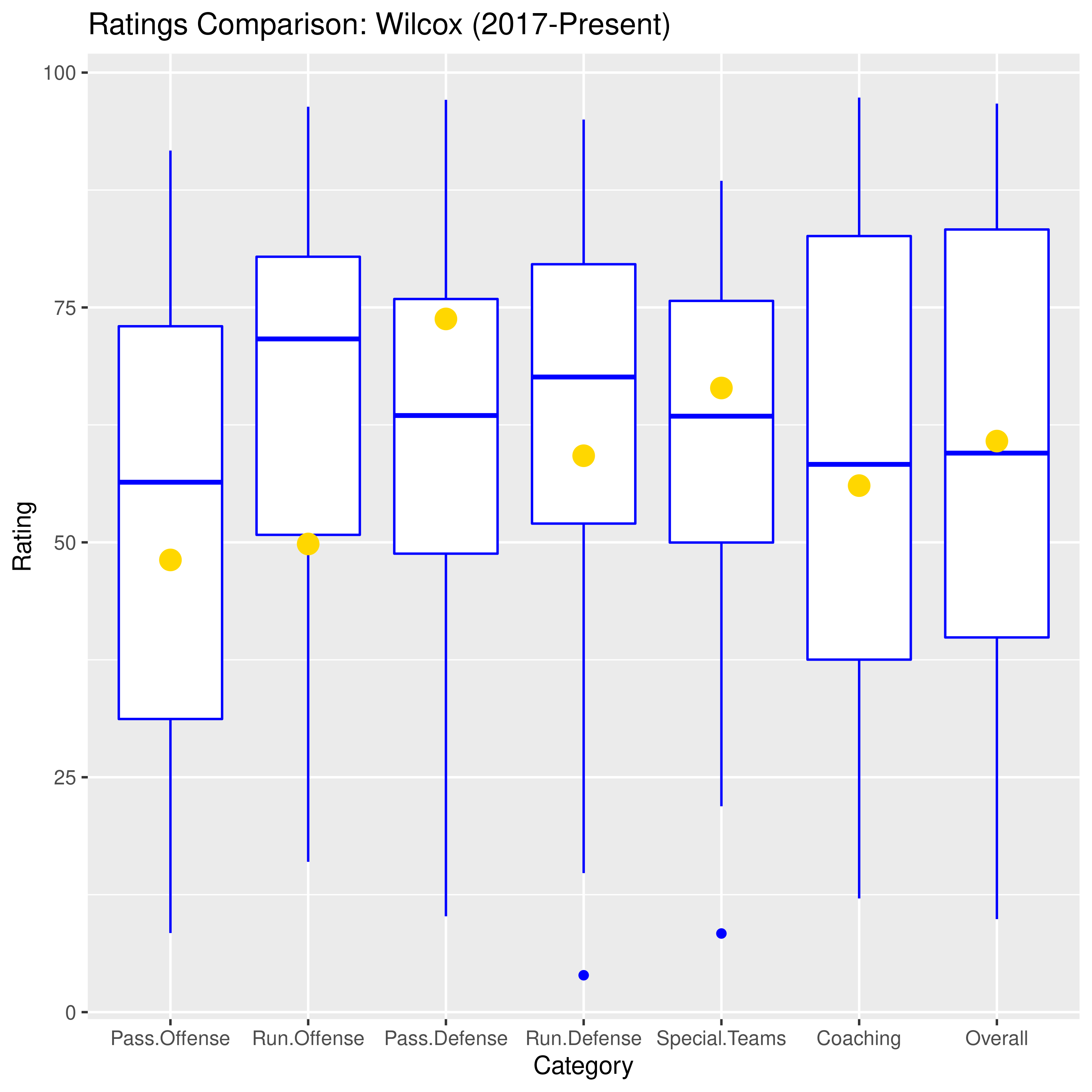 In a vintage Wilcox performance, pass defense leads the way while run defense earns acceptable scores. Meanwhile the offensive ratings drag down the team. Special teams remain a pleasant and consistent bright spot despite the lack of a dedicated special teams coordinator.