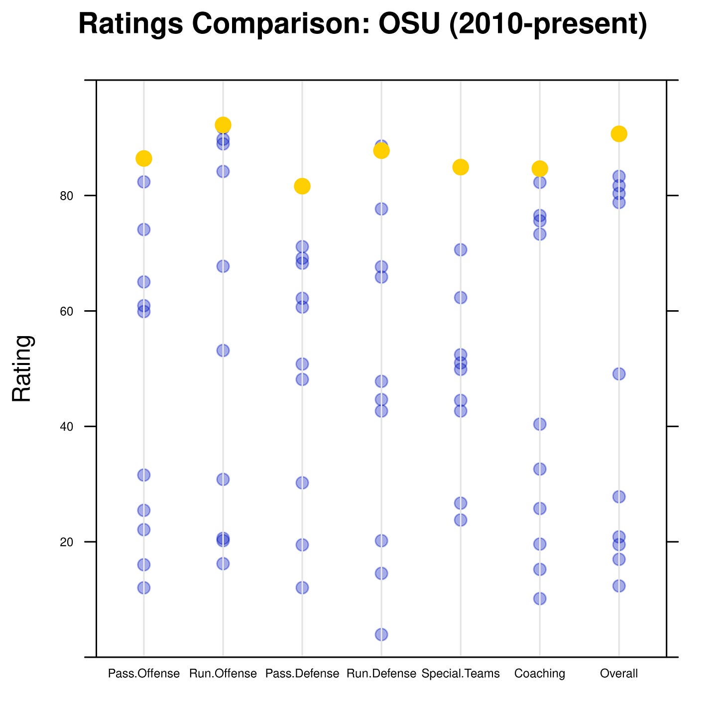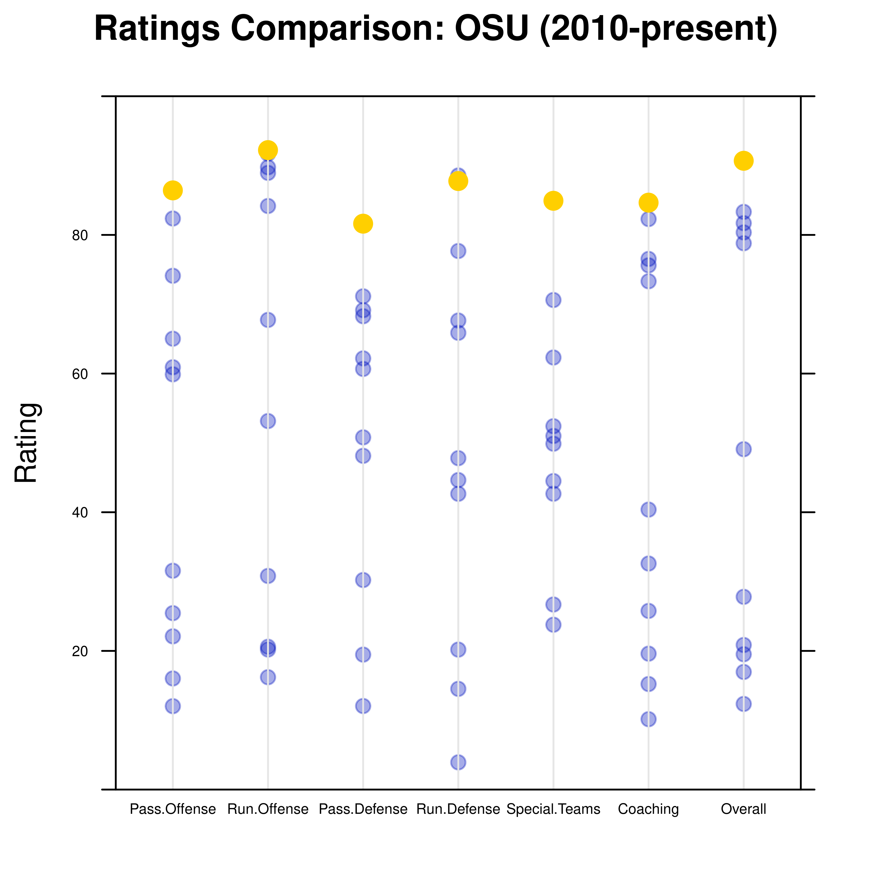 Every single category is above 80, a rare feat. The ground game rated highest as the Bears run all over the Beavs and shut down an extremely productive OSU running attack. Pass offense fared well while pass defense “only” scored 81.6 thanks to a few long completions by OSU. Can’t win ‘em all…
