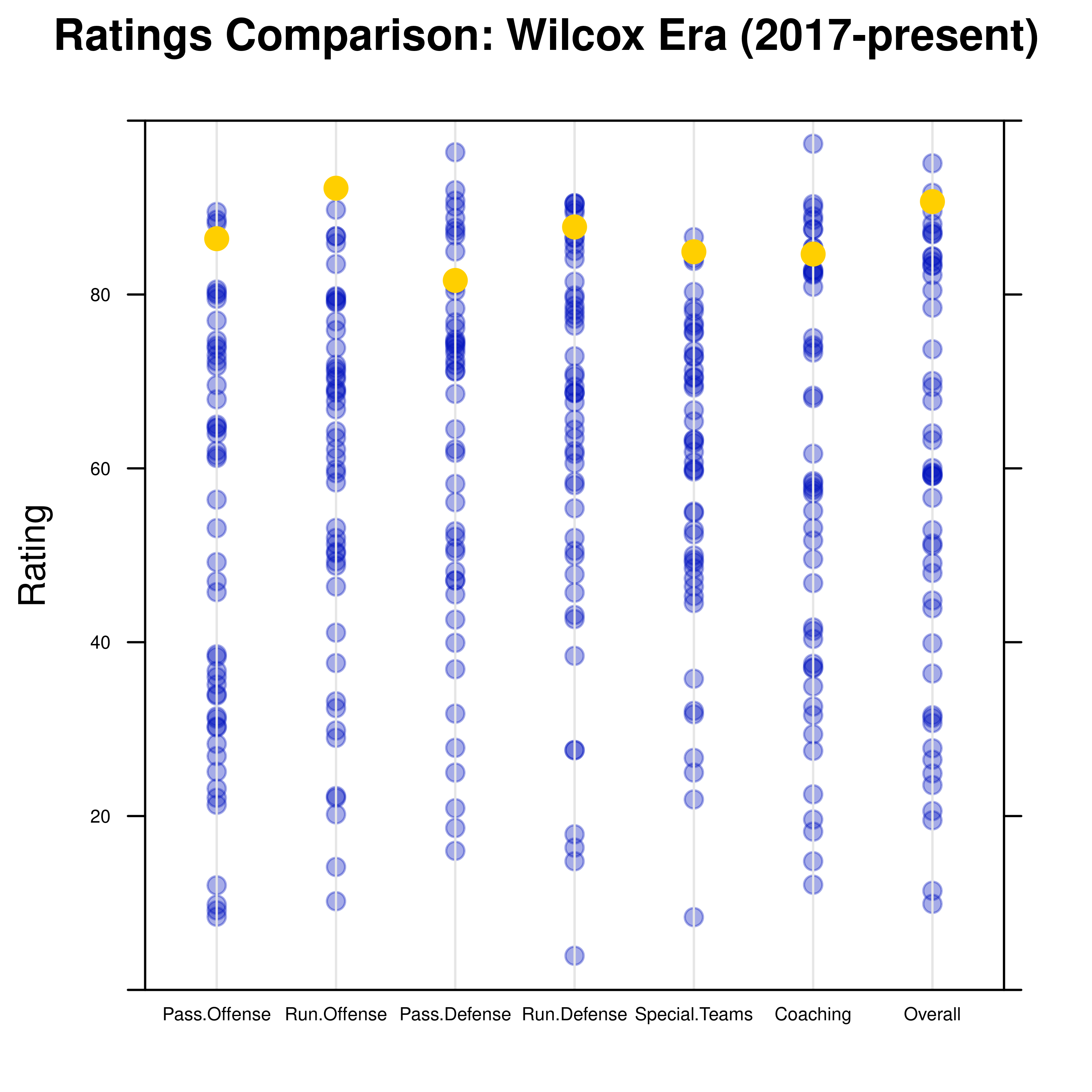 This one scored near the top in every single category since Wilcox took over as coach. In fact, this was the second-highest rated game in the time span as it only trailed the Wazzu blowout in 2017.