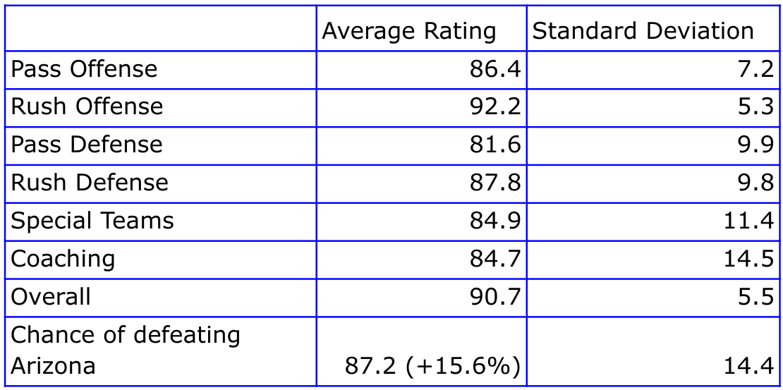 Special teams continues its pleasant streak of not only not ruining games, but being a net positive to the team! Coaching and overall enjoyed solid scores as well. And thanks to Cal’s consecutive strong outings and Arizona’s 20-game losing streak, we’re feeling better about the trip to Tuscon than we did during preseason.