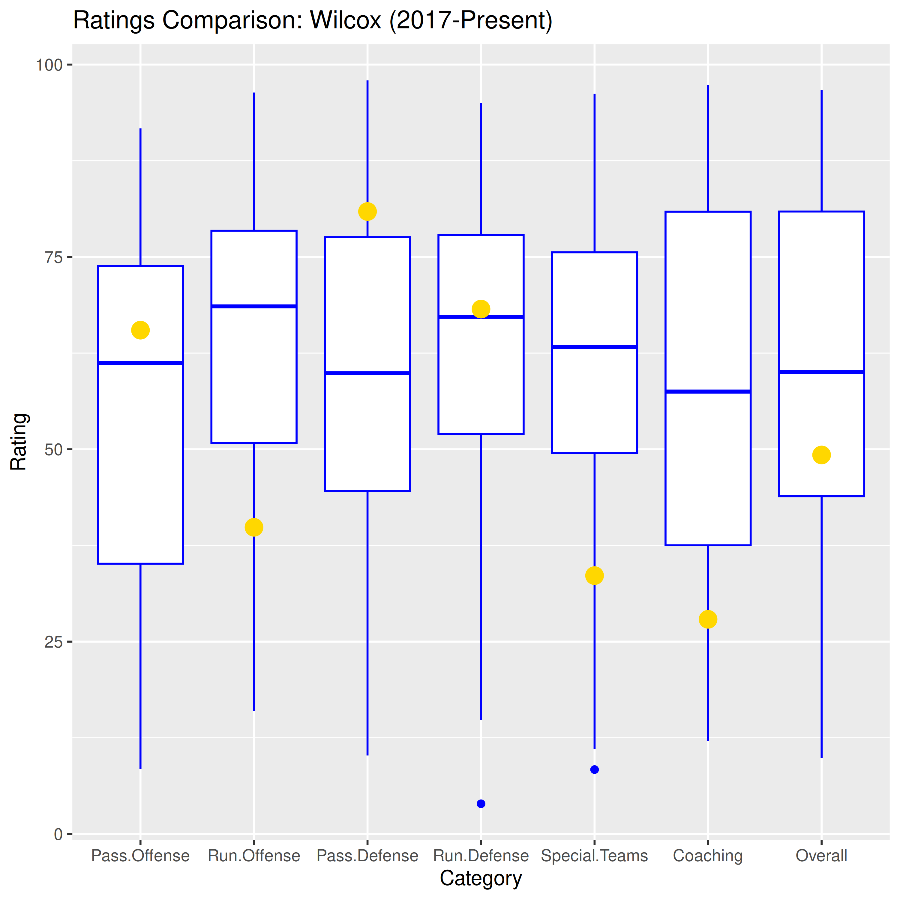 Pass offense was slightly better than usual while pass defense was substantially better than usual—an impressive feat given the number of stellar pass defenses Wilcox has fielded over the years. Run defense was typical. Overall was a bit worse than usual while running, special teams, and coaching were all much worse than usual. Comparing the medians across categories, Coaching is the lowest. That is not a great sign for Wilcox’s longevity at the helm.