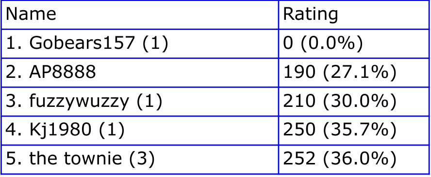 As always, we have three categories of awards to hand out for the lowest, highest, and most reasonable ratings of the week. Parentheses next to a name denote the number of previous awards for that reader.