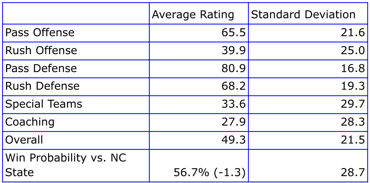Once again we have a stellar pass defense and strong run defense and pass offense, all mostly undone by a run offense that is unable to manage the clock or pick up consistent positive yardage. Some weird special teams decisions (2 point conversion, playing for the field goal on that last long drive) dropped the coaching rating to an abysmal 27.9. Despite the loss, our predictions of a win against NC State are nearly unchanged since late August. NC State’s 0-3 start in conference play and their struggles in non-conference games have turned a potentially tough matchup into a scrap between two desperate teams.
