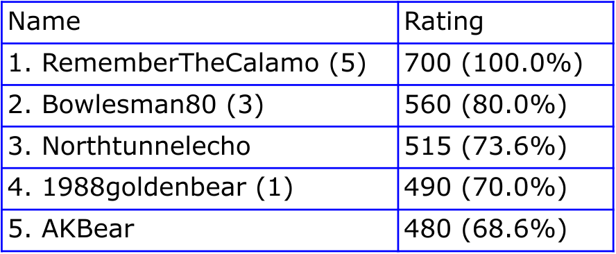 We’re returning to last year’s consistent pattern where Calamo and Bowlesman post a 1-2 finish where Bowlesman narrowly edges the third-place finisher.