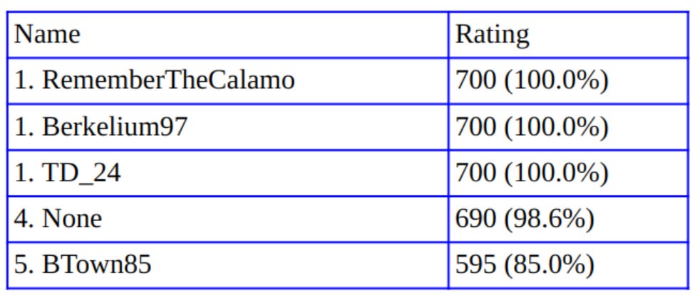 Three-way tie! I admit it’s hard not to drop 100s across the board in a win over LSJU.