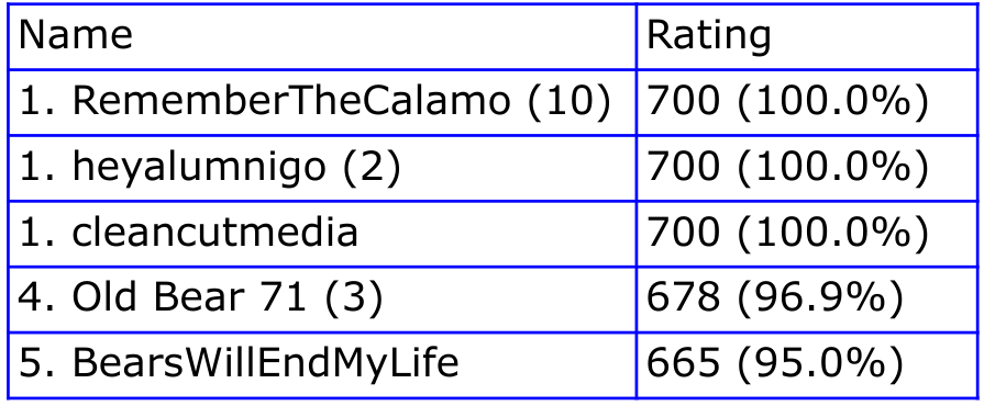 Three-way tie for first! BearsWillEndMyLife, a 5-time Old Blue this season, made a surprise appearance in with the fifth-highest ratings this week.