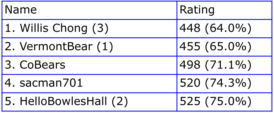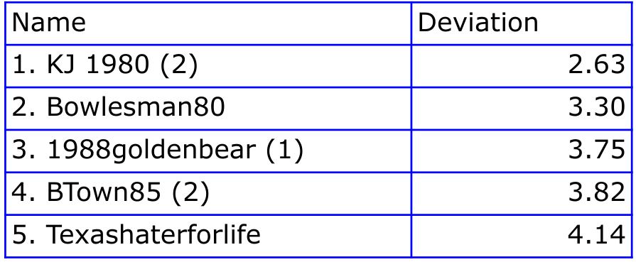 KJ 1980 earns the lowest score we have seen all season—well done! After ten consecutive Sunshine Pumper awards, Bowlesman80 joined the Voice of Reason recipients this week. All three categories this week featured the leading award recipient (or co-leader, as Bowlesman shared the Sunshine Pumpers title with Calamo) for one of the other categories—that’s a rather interesting result.
