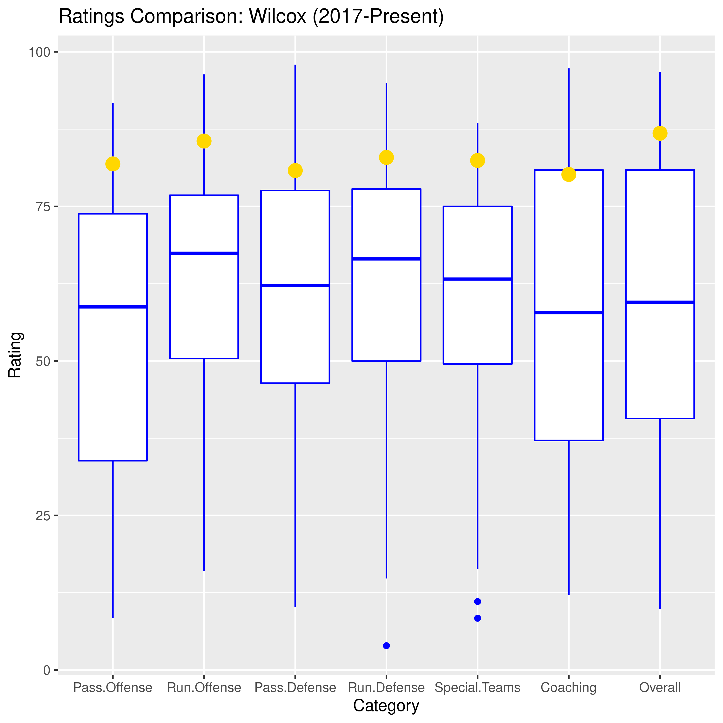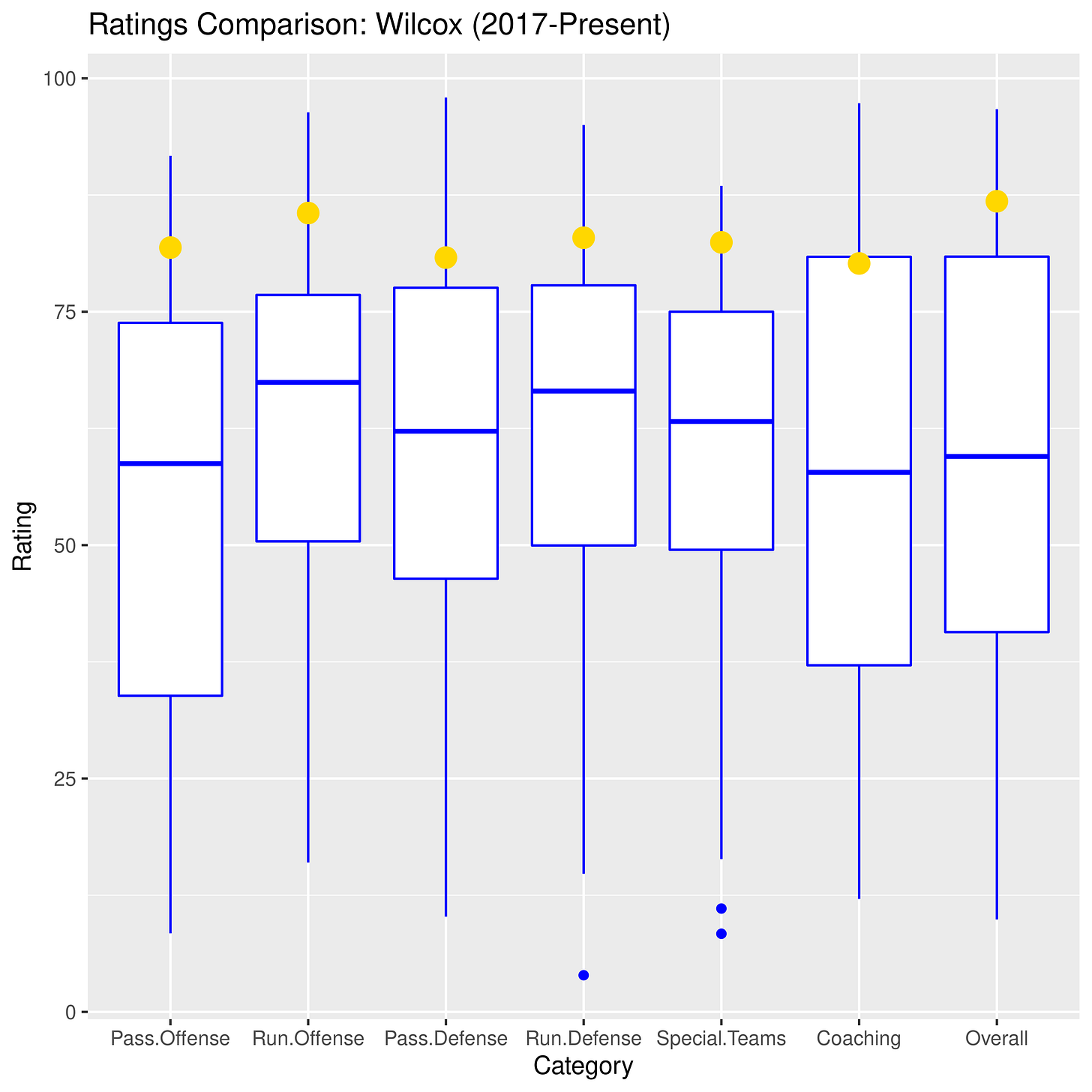 The only explanation I need to give about how to interpret these boxplots is this: points above the box are above the 75th percentile and thus excellenct scores. Just about every rating finishes at that level in comparison both to prior Big Games and to the rest of Wilcox’s tenure.