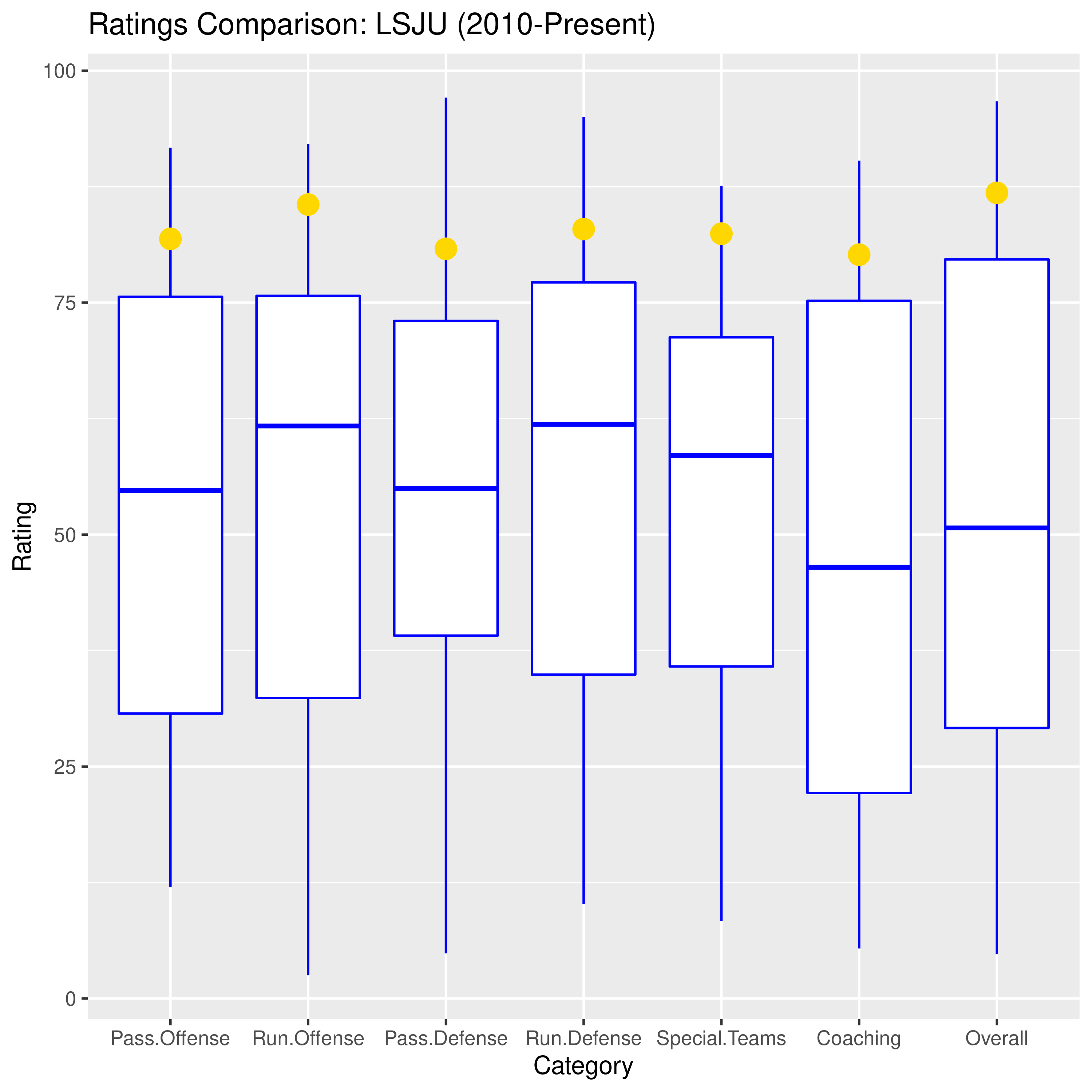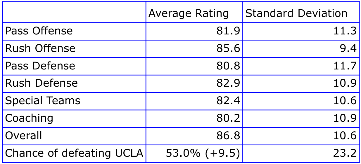 Cal has lost far too many games to the Lobsterbacks since we have started this series, so this week’s ratings compare quite well to the rest of the data.