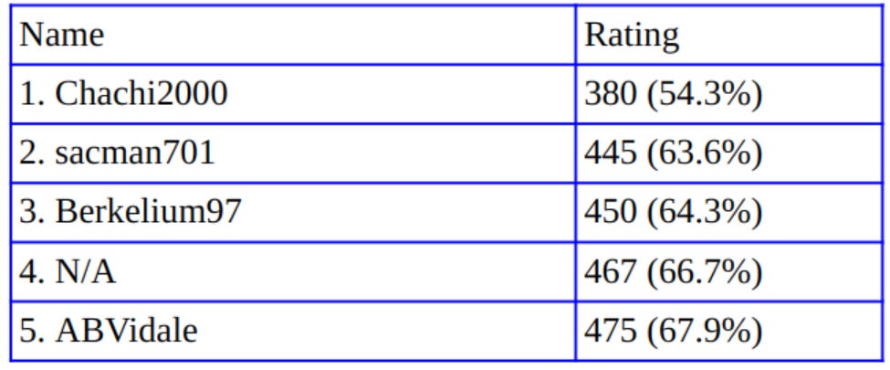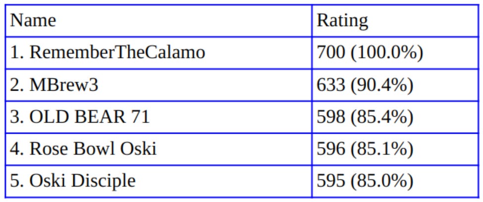 Ben Franklin once wrote in a letter: “[I]n this world nothing can said to be certain, except death, taxes, and a perfect rating from Calamo.” Same as it ever was, Calamo leads the way with a 100% rating. MBrew3’s 90.4% rating finishes second while spots three through five were remarkably close.