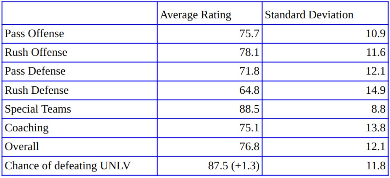 Coaching and overall round out the results with strong scores. And our expectations of a win over UNLV have climbed slightly since preseason. Although after reading yesterday’s UNLV Offensive Preview, my optimism has waned a bit.
