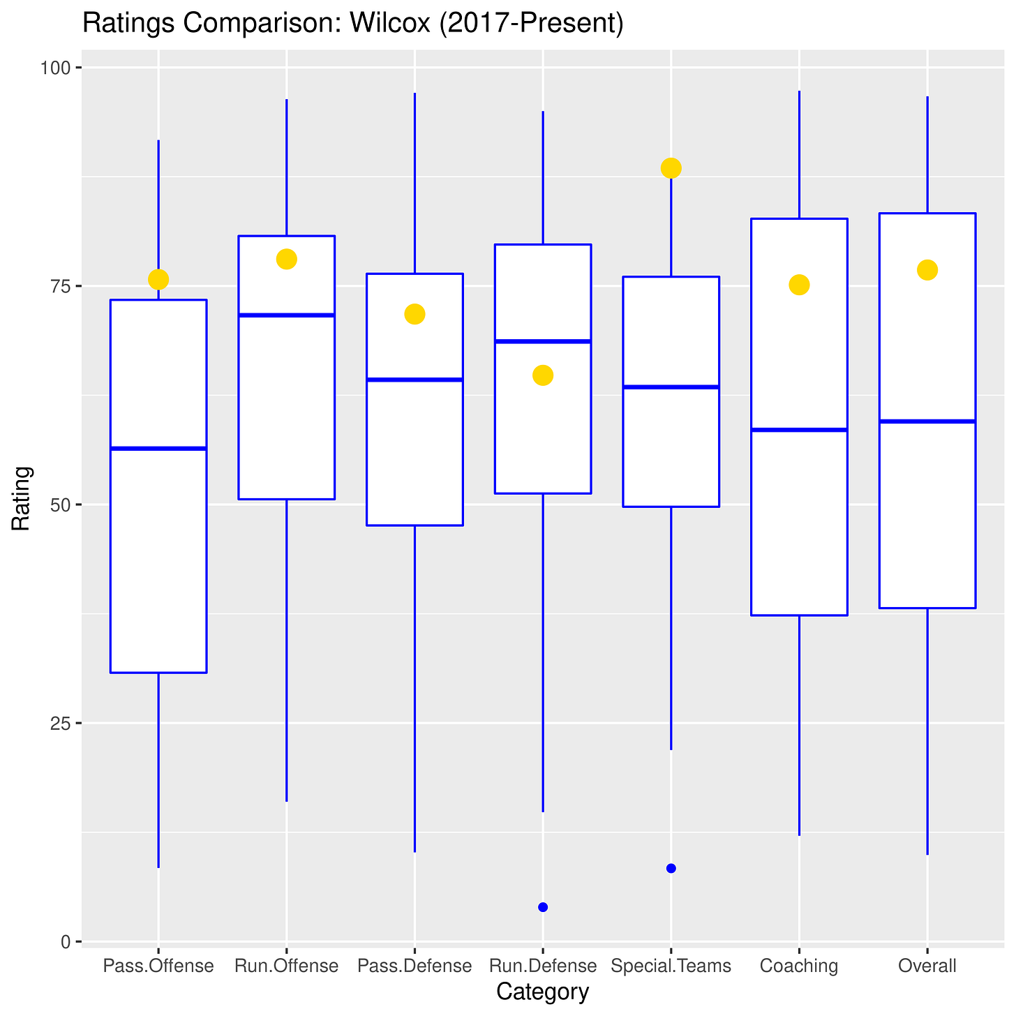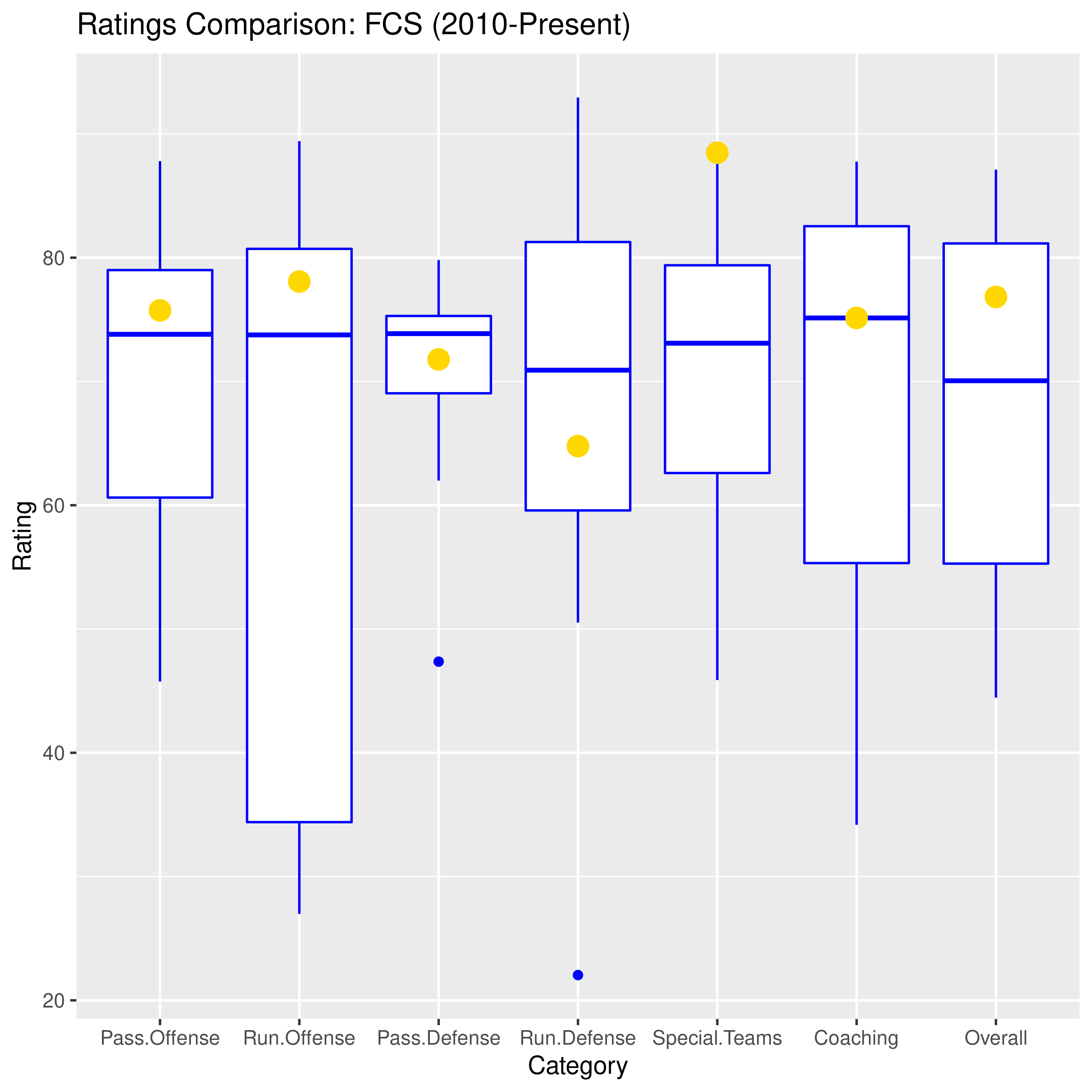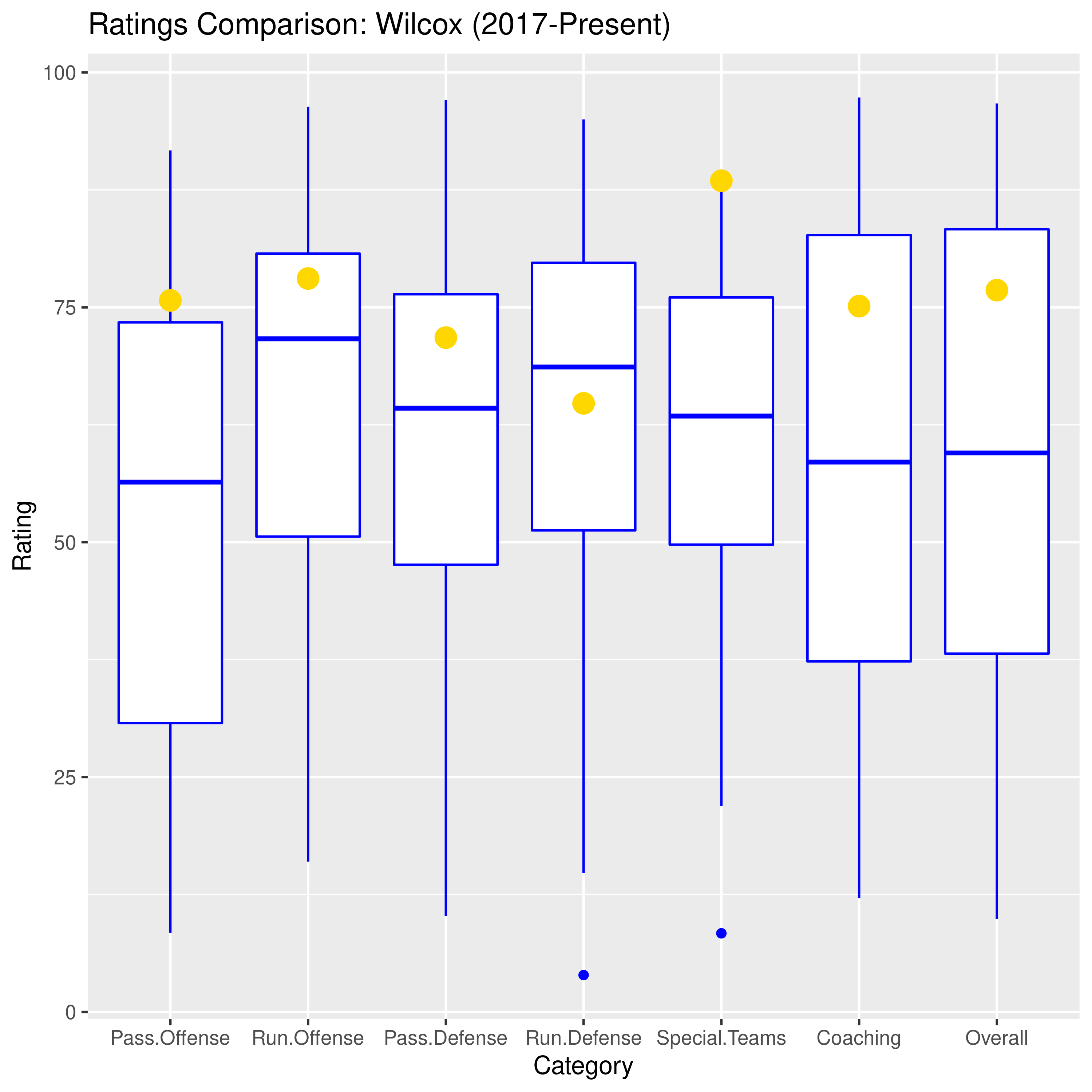 We had previously used dot plots to visualize these historical ratings, but we started accumulating so much data that the plots became visually cluttered. So now we are using boxplots. For these plots, the blue horizontal line inside the white box represents the median: 50% of the ratings are above that line and 50% are below. The box represents the middle 50% of the data (that’s the range between the 25th and 75th percentiles, or the interquartile range if you’re feeling fancy). The “whiskers” coming off the box capture most of the variation outside that interquartile range and any blue dots represent extreme outliers. For example, that abysmally low dot in the Run Defense category captures that 2013 Portland State game when the Vikings and their offense ran wild against Andy Buh’s “defense.”