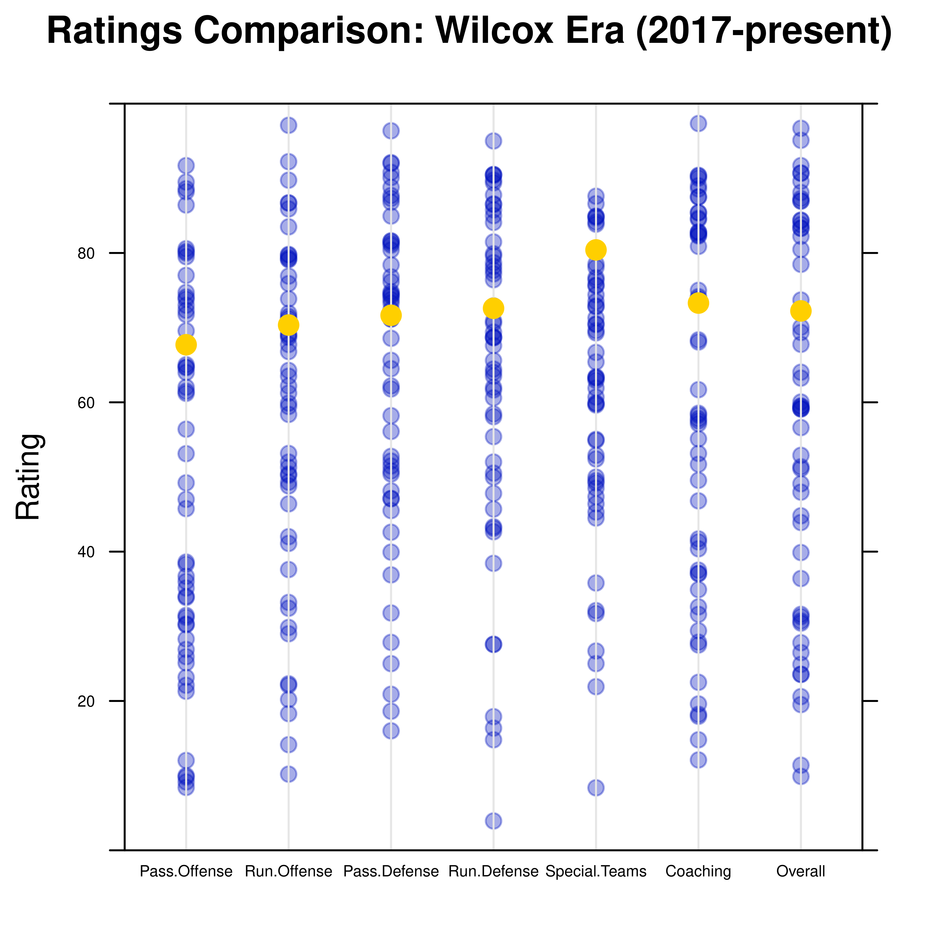 Compared to the rest of the Wilcox Era, Saturday’s win is above average in all categories (side note: I need to update how these figures are displayed next season now that we have five years of games under Wilcox).