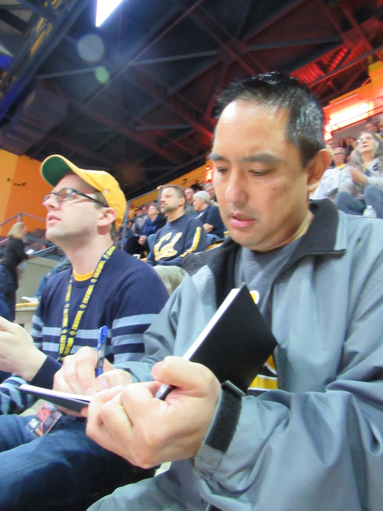 Larry fused intelligence and emotion in a way that still awes me. Many of you may be familiar with the ‘Robot Larry’ nickname that Kodiak bestowed on him. It was a nickname that he earned because he understood basketball on a different level. Years spent learning about the game, watching it at every level, spending time breaking down each play from every Cal game, tracking everything in spreadsheets. There were games when he would sit next to me and call out the plays we were running, which typically made him grumpy because it meant that Cal’s opponent probably also figured it out too. Larry was razor sharp. Here’s a picture of him taking notes at a game . . . against Cal Poly: