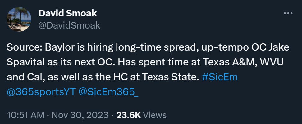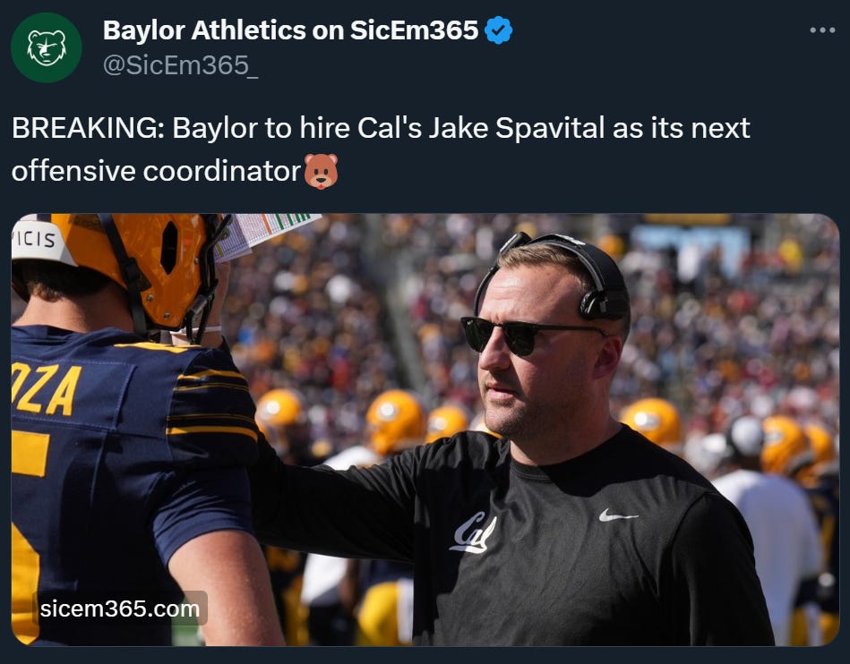 In Spavital's one year return at Cal, the Bears made remarkable offensive leaps. Cal jumped from 24 points per game (96th in FBS) to 31.6 (tied for 40th), and made leaps in advanced metrics (from 91st in SP+ to top 40 this year). Cal also saw the development of Jaydn Ott into the Pac-12's leading rusher, and gained a potential future starting quarterback in Fernando Mendoza.