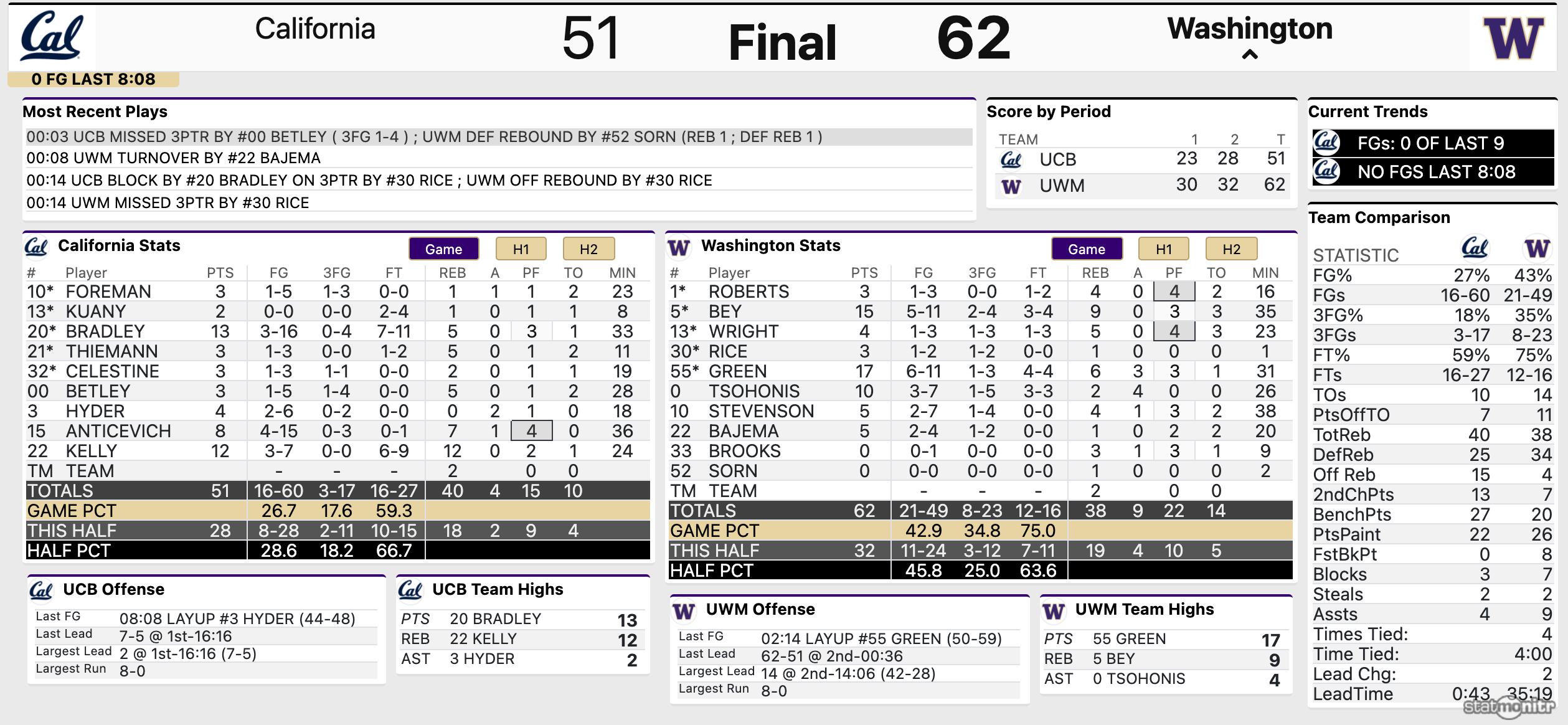 This loss probably cements our position as the worst team in the conference this season, even if we were to win one of the upcoming final 2 games Washington would have the tiebreaker. We still would hold the 11th seed in the Pac-12 tournament because Arizona has a self-imposed post-season ban. So, the game in summary?