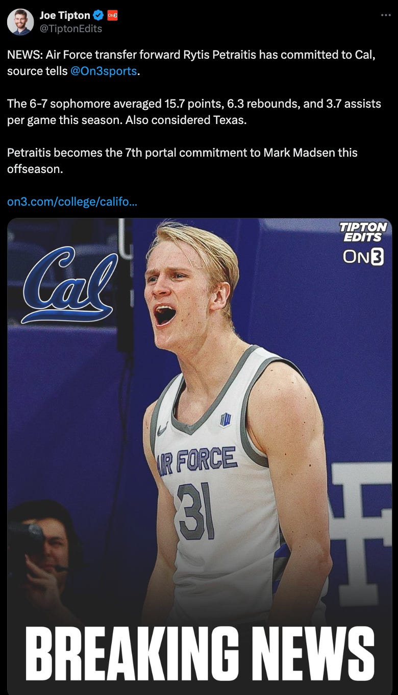 Cal men’s basketball has found another significant contributor this weekend. Meet Rytis Petraitis, a forward transfer from Air Force, who picked the Golden Bears over the Texas Longhorns this weekend after making the visit last week. Petraitis joins Andrej Stojakovic as the two biggest commits of the transfer portal cycle.