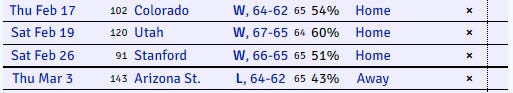 I was not counting this game as a win; but now that itās added to the ledger, Cal can now enjoy four straight very winnable games with a chance to finish as high as 9th in the conference. Modest goals, certainly, but that would constitute Calās best conference finish since Before Wyking (BW). Heck, if youāre inclined to trust Our Computer Overlords, Cal is actually a slight favorite in three of their next four games: