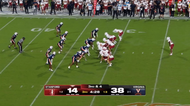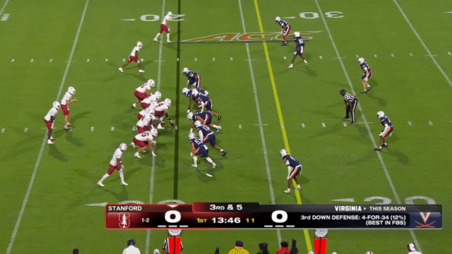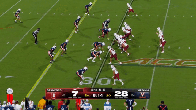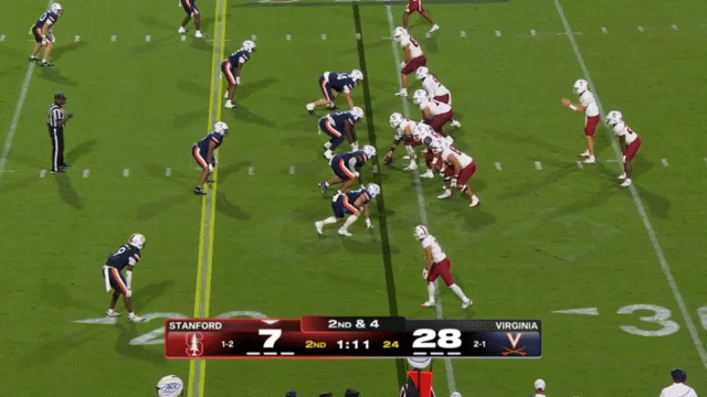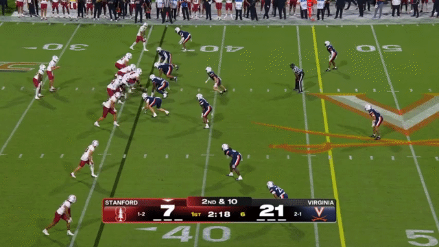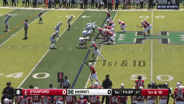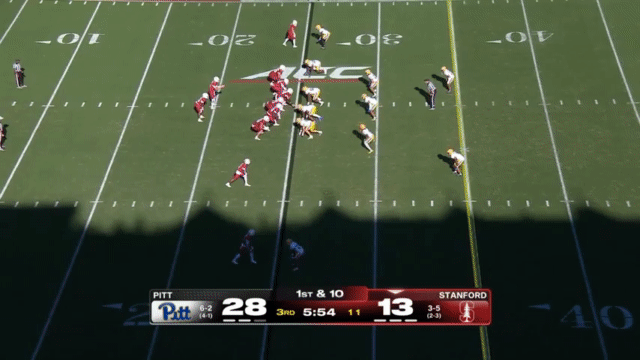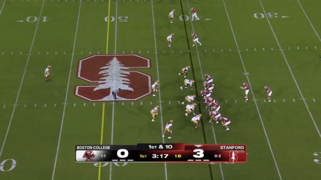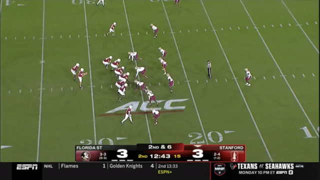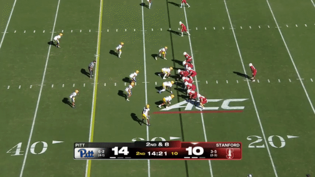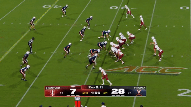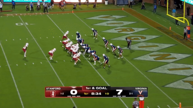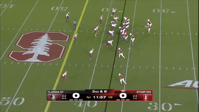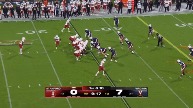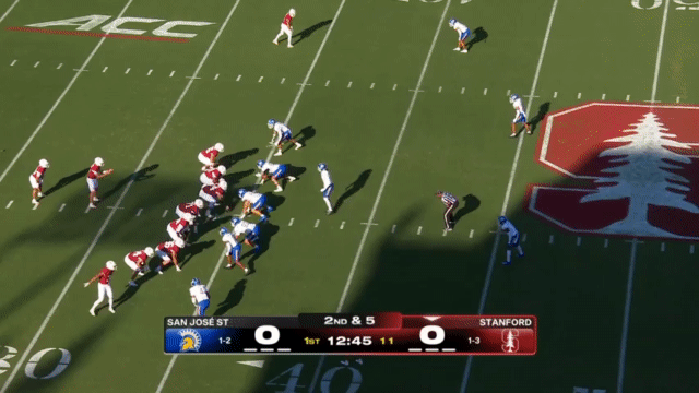 Stanford is a team that has an offensive line. PFF grades rank Stanford as the 114th ranked team (out of 136 FBS teams) in run blocking and the 128th ranked team in pass blocking. It can be surmised then, with a ranking near the top 100, that run blocking is thus a relative strength of this Stanford team. Here we can see an example of Stanford run blocking: