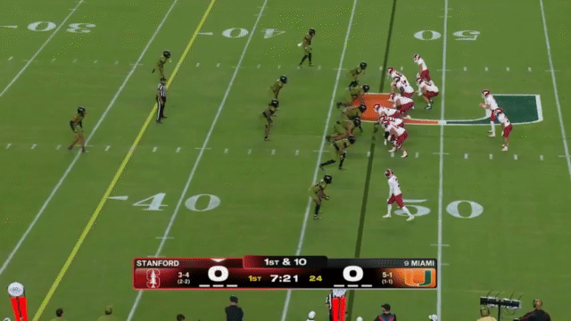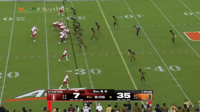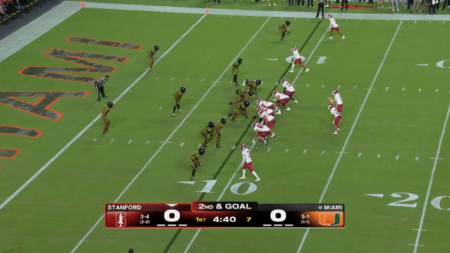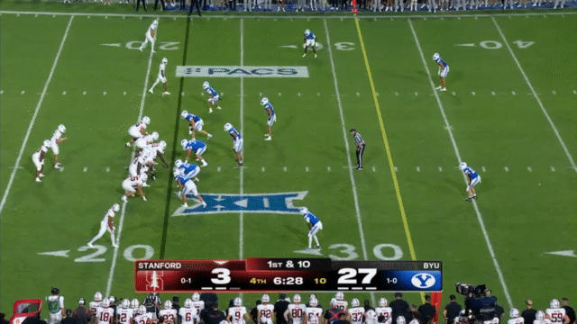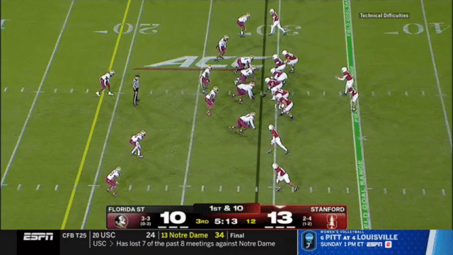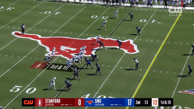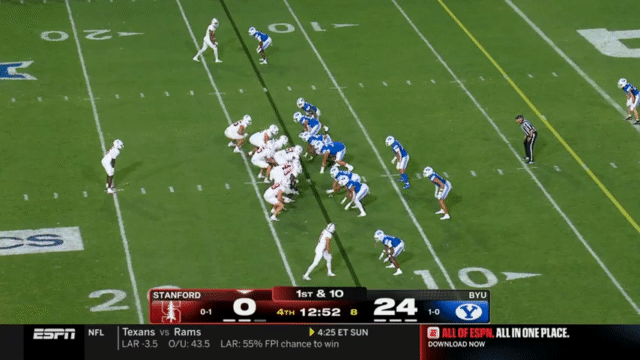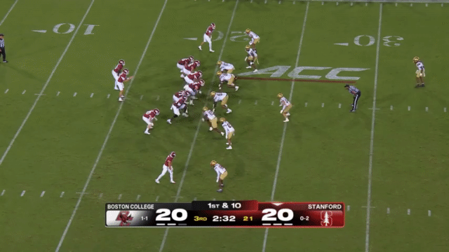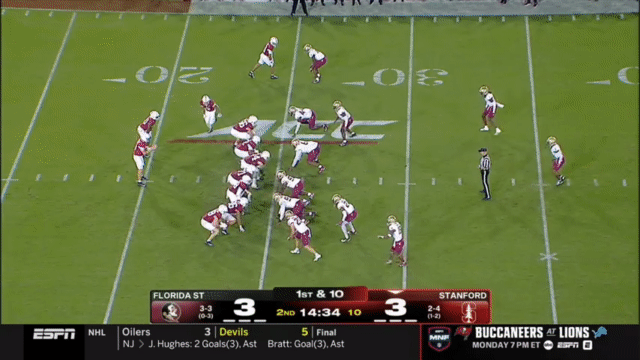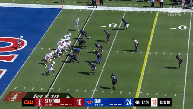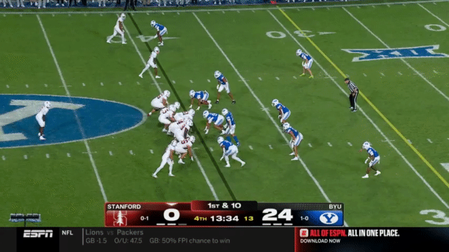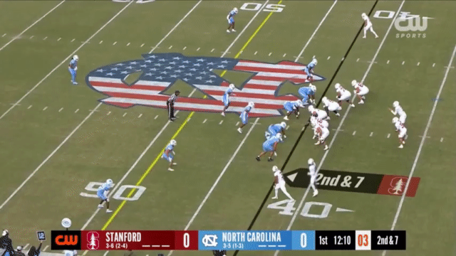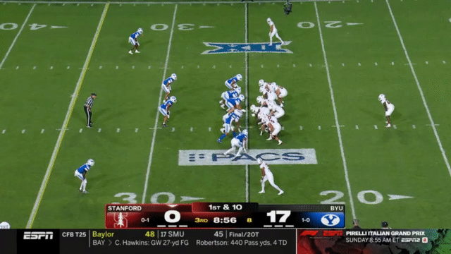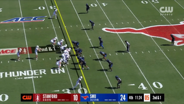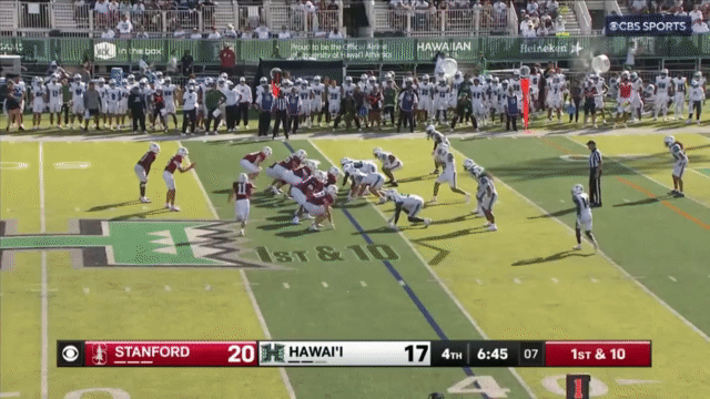 Stanford is a team that has an offensive line. PFF grades rank Stanford as the 114th ranked team (out of 136 FBS teams) in run blocking and the 128th ranked team in pass blocking. It can be surmised then, with a ranking near the top 100, that run blocking is thus a relative strength of this Stanford team. Here we can see an example of Stanford run blocking: