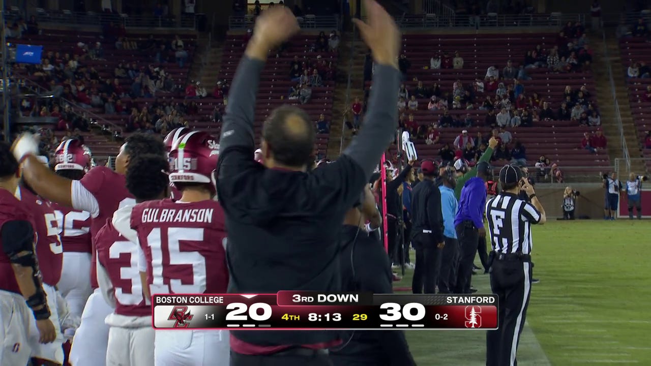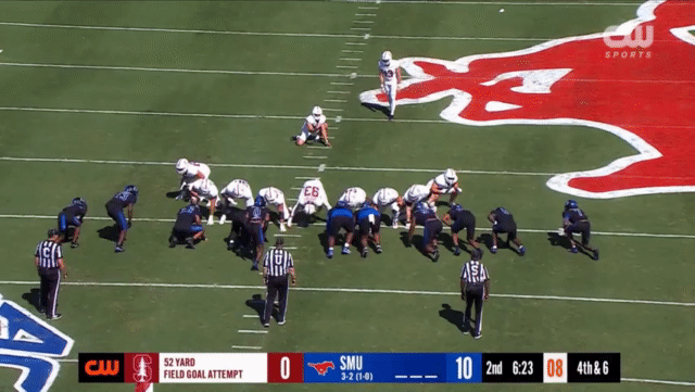 This doesn’t show up on the stat sheet (because there was an SMU penalty on the FG try, Stanford accepted, and then turned it over on downs), but Stanford kicker Emmet Kenney hit a FG from 52 yards with plenty of leg, so safe to say that they have a kicker with some range: