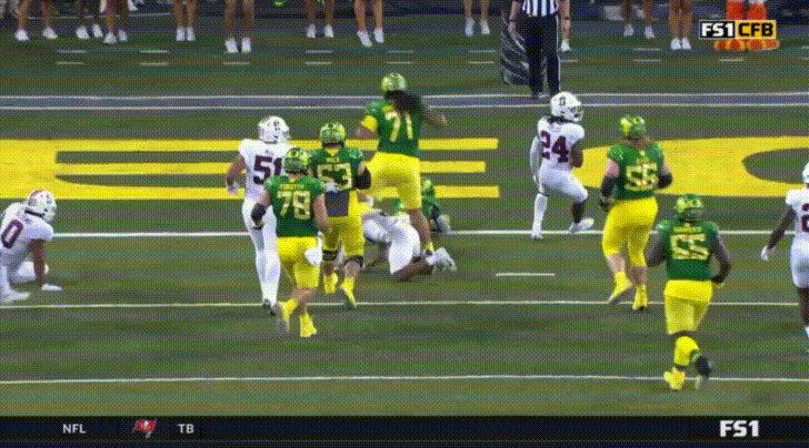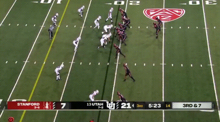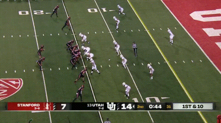 Lastly, there’s the weakside linebacker, Tristan Sinclair, who’s built more like a safety than a linebacker. I’m at least thankful Stanford didn’t invent a position name for a hybrid LB/S like most teams (KAT, STAR, JOKER, RUSH, STUD, HUSKY, VYPER, etc)— what would you even call it at Stanford, TREE? You can see Sinclair in the earlier DE David Bailey clip, where he looks to be lined up as an outside corner. Like Miezan, he’s also not a particularly strong tackler (also at 22.5% missed tackles per PFF), but I don’t really think he’s spectacular in coverage either.