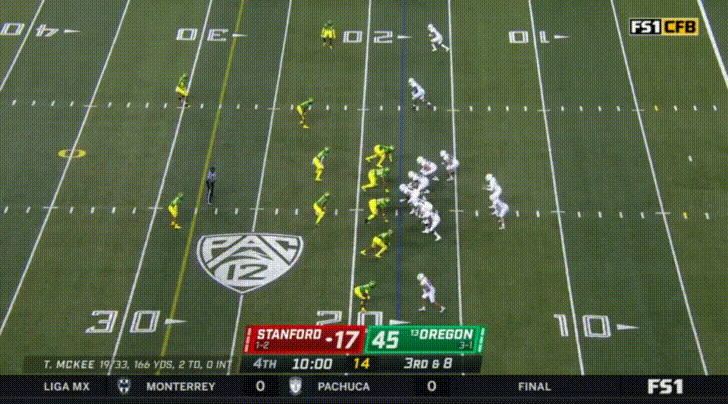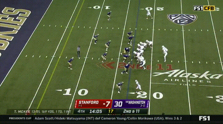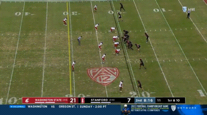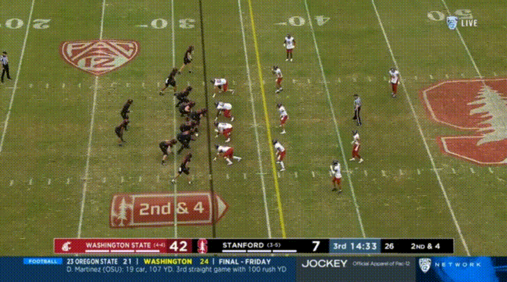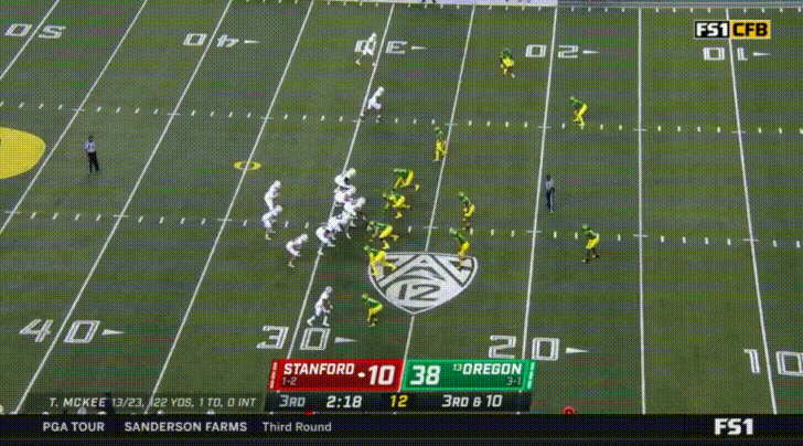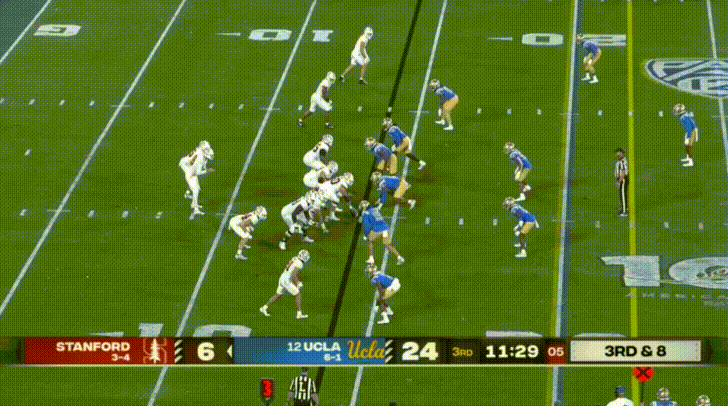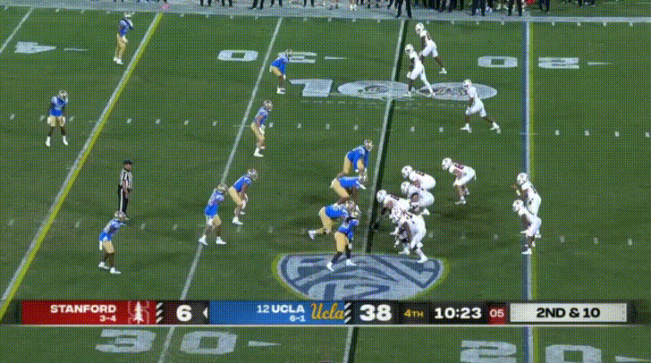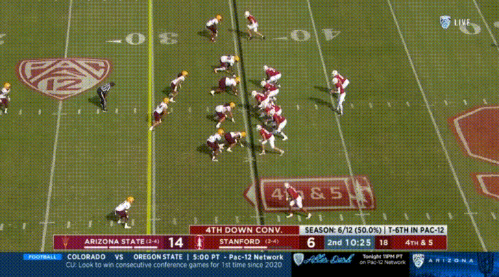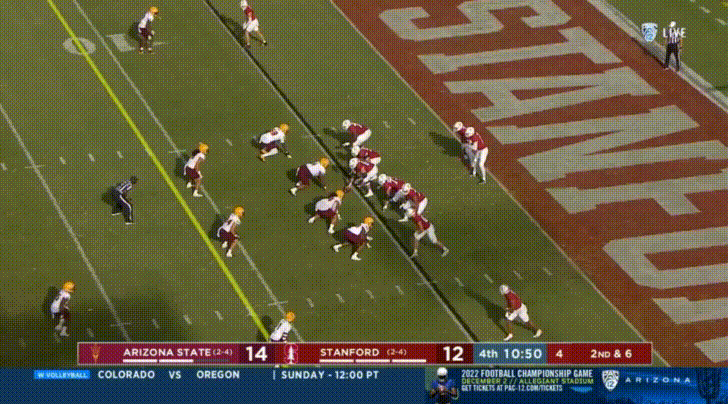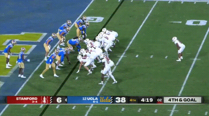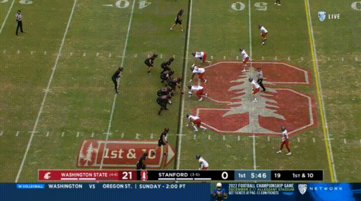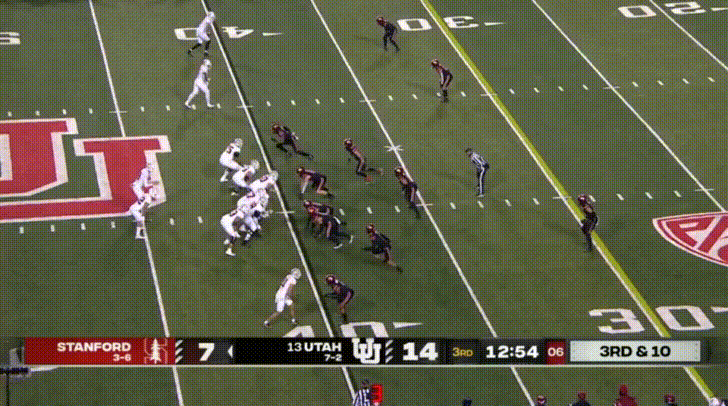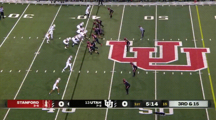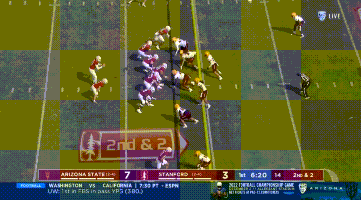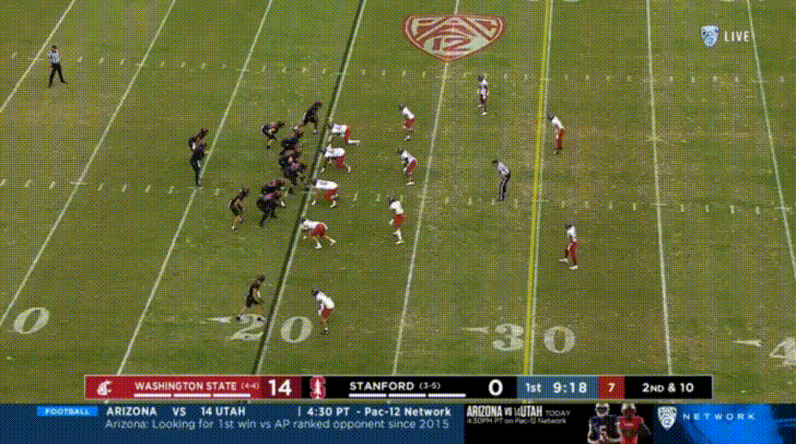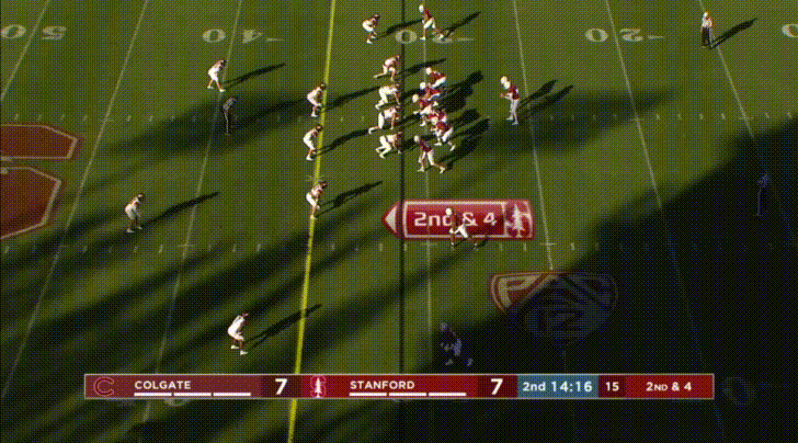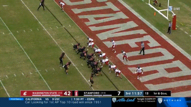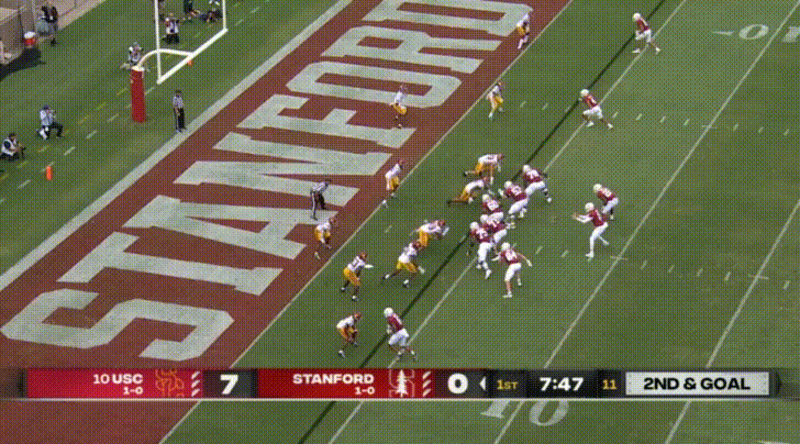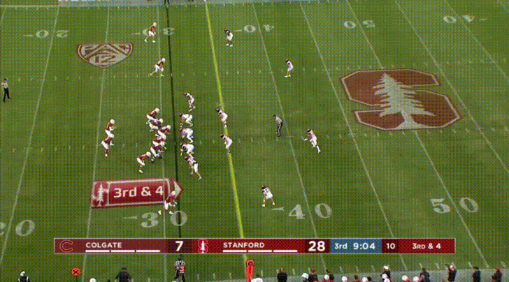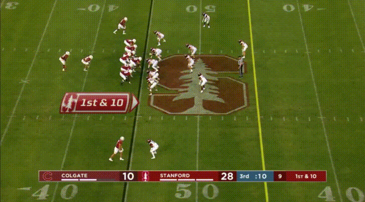 Of course, there are a number of reasons this has not worked out for Stanford. For one thing, Stanford has no run game to respect. RB EJ Smith is a fantastic running back, but they lost him early in the season to injury. The backup running back, Casey Filkins, also lost for the season to injury. Third and fourth string running backs, Caleb Robinson and Brendon Barrow, are not lost for the season, but both have missed multiple games due to injury. Stanford’s current starting running back, Mitch Leigber, is a converted safety (he played safety earlier this year, in fact). He’s being used primarily as an extra blocker in pass protection, as this offensive line is rarely going to open up holes for him to run through.