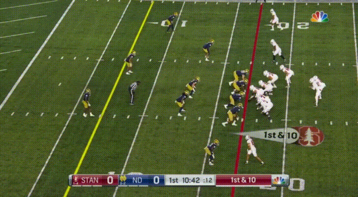 Since the USC game, Stanford has been running a slow-mesh offense (borrowed from Wake Forest), in which the quarterback tries to ride out the mesh point with the running back. If you are in zone coverage, you put the linebackers in a bind: either the running back runs against a lighter box if the linebacker defends the pass, or the linebacker sucks in to defend the run and opens up a passing lane behind him for the QB to pull the ball back and throw. If you’re in man coverage, there is no underneath help as the linebackers have to respect the run game, and you have to play man coverage against some big Stanford receivers (who, in previous years, were deadly on endzone fades and the like).