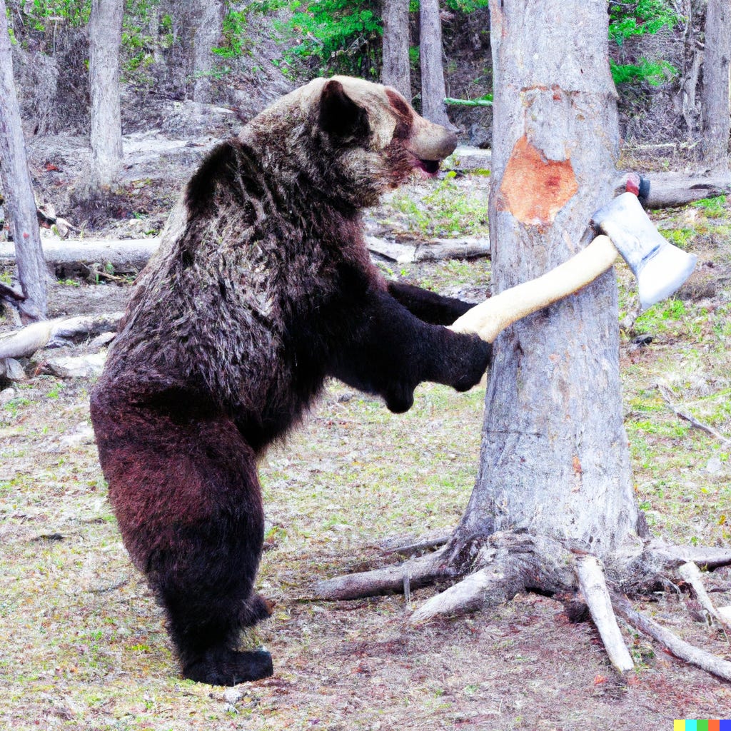 Is that a bear cutting down a tree with the blunt end of an axe? Yes, that sounds like an appropriate allegory for the game: the tree is not going to hurt the bear, but if the bear could just figure out how to attack, the bear would make short work of the tree.