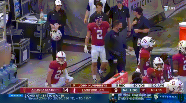 While no one is surprised if a quarterback doesn’t play as well when he’s under constant pressure all game (and why I think Jack Plummer gets nowhere near the respect he deserves) or that a team missing its best running backs will struggle to run the ball, there’s really no excuse for how poorly Stanford’s talented receivers have been playing this season. Wide receiver Bryce Tremayne was an absolute stud last year, until he suffered a gruesome season-ending ankle injury at the hands of Oregon CB Dontae Manning. With him out, the Stanford passing offense then revolved around the tight end Benjamin Yurosek, a sure-handed, big play, contested catch type of receiver. In fact, that describes most of Stanford’s receivers (Tremayne is 6’4” 212 lbs, Yurosek is 6’4” 242 lbs, WR Elijah Higgins is 6’3” 234 lbs, and WR John Humphreys 6’5” 209 lbs)— although to various levels of success. It’s very clear that after the success of similar big-bodied receivers at Stanford (JJ Arcega-Whiteside, Simi Fehoko, Colby Parkinson, etc), they decided to build an entire passing offense around big-bodied receivers that can make contested catches with a quarterback accurate enough to throw them 50-50 balls (somewhere on the field there will be a 6’4”+ receiver against a smaller defensive back, and Stanford is expecting better than 50-50 odds on a jump ball against a much smaller DB). Like most things that David Shaw has done at Stanford, this worked until it didn’t.