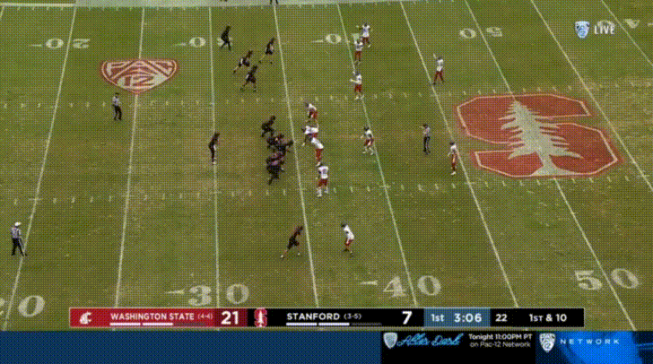 Tremayne is Stanford’s best contested catch receiver (on a roster full of them), as he has a very large catch radius with strong hands to make catches away from his body as the defensive back is ripping at his arms: