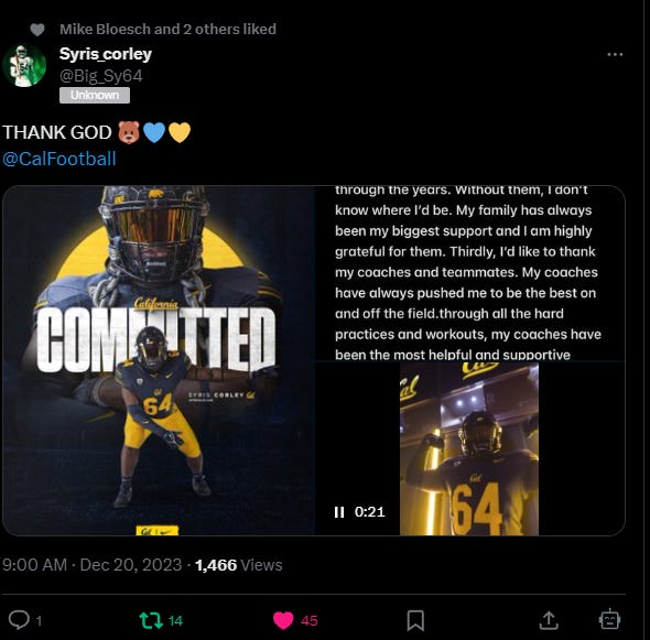 Cal landed a huge commitment on Early Signing Day to bolster their offensive line ranks. Syris Corley from Taylor, Texas committed to Cal this morning. Corley made a visit to Berkeley early this month, and Corl made the call to be a California Golden Bear today.