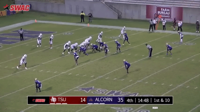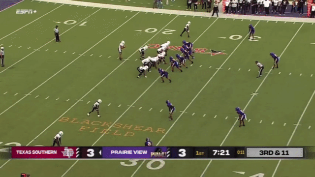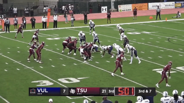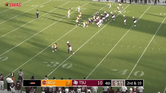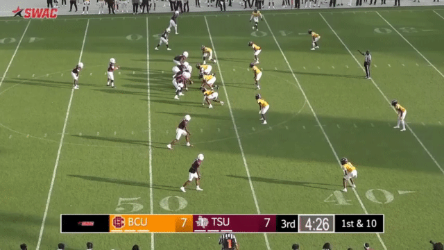 In obvious passing situations, TSU will line up their tight end at the Y-position. A new addition to the team is the 6’4” 250 lbs. tight end, Jalen “Dubb” Williams, a recent transfer from Saginaw Valley State (D2). He had two catches last week, including this one: