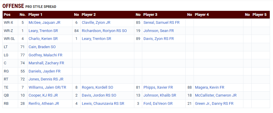 Another player that I think is really talented and would not be surprised to see big things from is the running back Chaunzavia Lewis. Lewis is track-star fast and very shifty, although particularly undersized for a college running back (listed on the official roster as 5’9” 155 lbs). He didn’t play in the previous game, and I have no idea how to check if he’s injured or something else, but he’s definitely someone to keep an eye on.