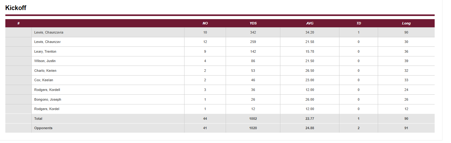 It turns out—no, I am watching the right game, the stats recording is just a complete mess. The quarterback just rushed for a touchdown, but the running back received credit instead. If I try to get some insight about players to watch ahead of time by looking at the official stats, I can see that TSU’s two leading kickoff return men are “Lewis, Chaunzavia” and “Lewis, Chaunzav” (2024 > Individual > Special Teams > Returns). In fact, here’s a screenshot, in case anyone gets the idea to fix this after I reported on it: