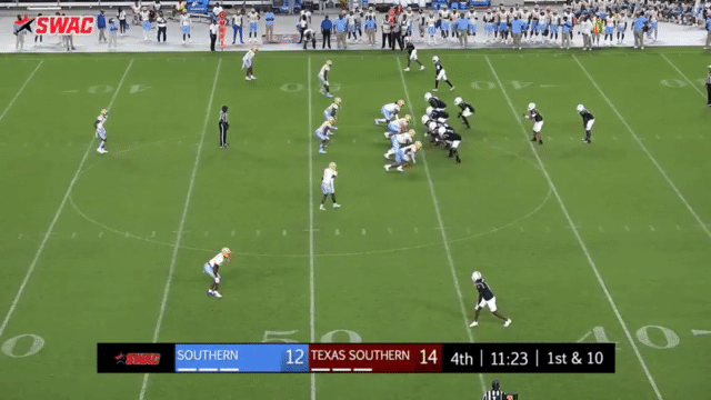 The kicking game was less impressive. Punter Jeremy Ramirez was named preseason All-SWAC 2nd team in 2024, and immediately after the announcer mentioned this, Ramirez shanked a punt out of bounds for about 10 yards (an unfortunate announcer’s curse, but worth noting). Ramirez was again named preseason All-SWAC 2nd team in 2025.