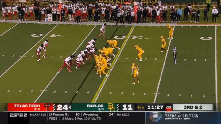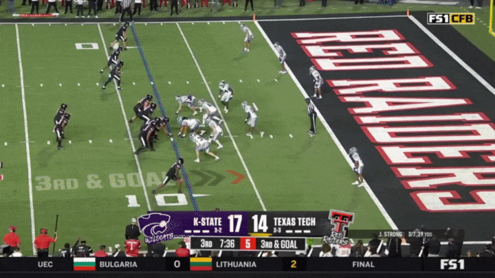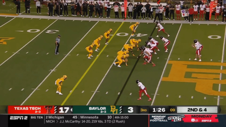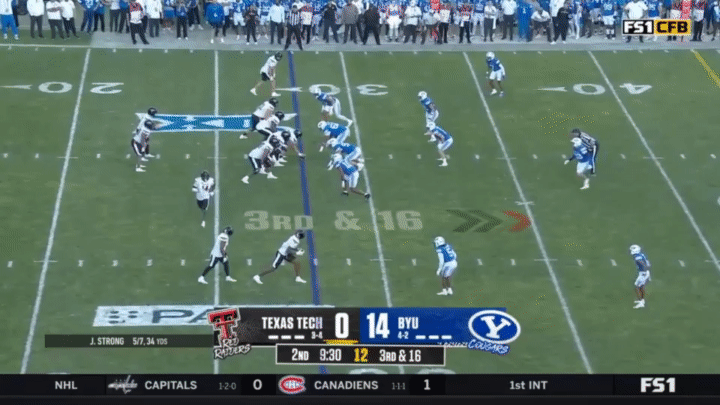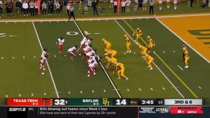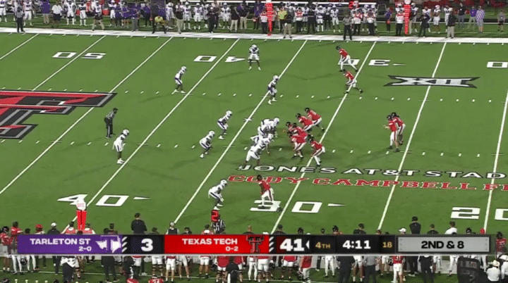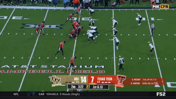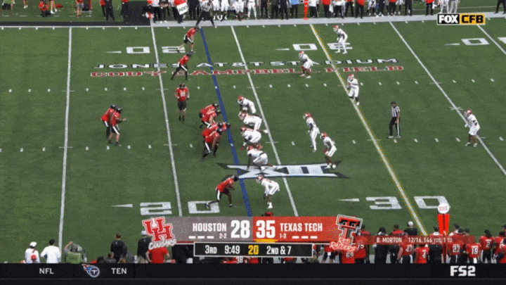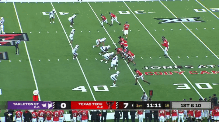 For the most part, though, Morton is making half-field reads (at best), and is often locked on to his first receiver. The Texas Tech offense throws out a lot of bells and whistles (motions and formations) as distractions, but a lot of it is trying to get a lighter box to run against, or something like we get in the following play. Here, you can almost feel that the receiver at the top of the screen, WR Coy Eakin, is getting the ball—look at the jump he gets on the snap on this timing route: