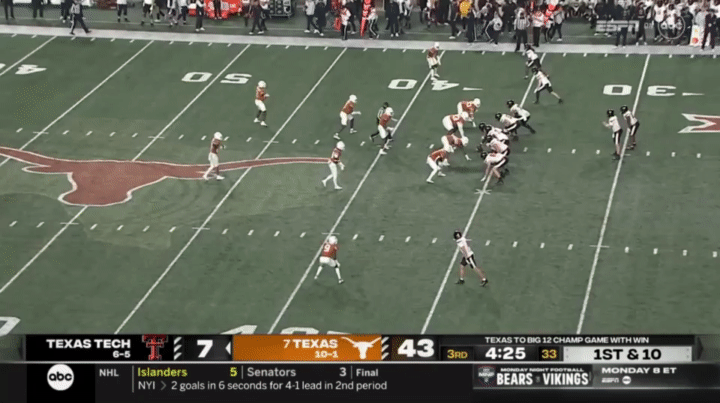 I think Texas Tech’s best inside receiving threat is probably the 6’9” 270 lbs TE Mason Tharp, who has returned in recent weeks after missing the middle part of the season with an injury. Tharp is a natural receiver with good hands, and a decent-to-solid pass blocker. Surprisingly, he’s only targeted a few times per game: