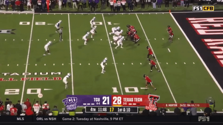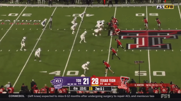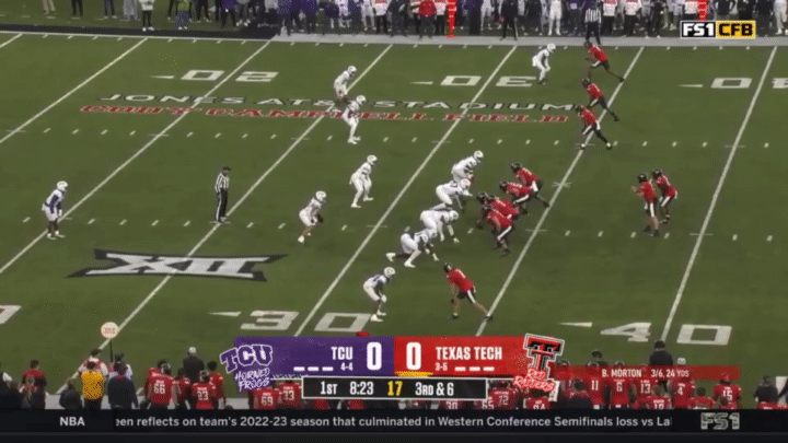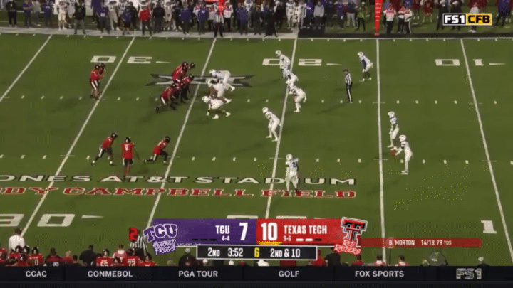 QB Behren Morton’s favorite target is probably Coy Eakin, which means Eakin gets a lot of looks in the shallow part of the field (short curls, shallow crossing routes, etc, usually under 10 yards). Here Eakin slips a TCU defender for a nice gain:
